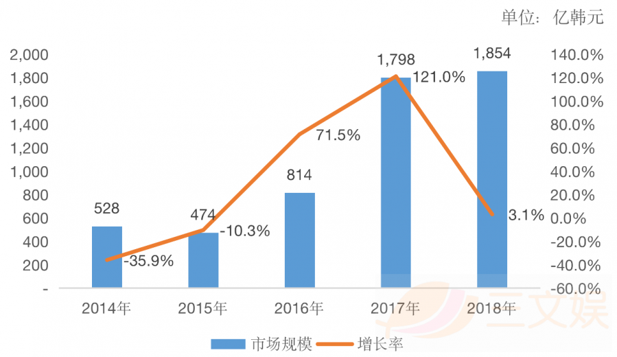 纵观韩国街机游戏市场规模的变化,一直到2015年都在减少,直到2016年突然以71.5%的增长率上升后,2017年更是突破了121%。但这个增长态势在2018年没有新游戏出品,以及没有新的游戏厅开张等原因的影响下减缓。