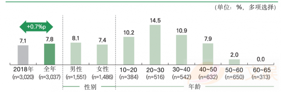 街机游戏的使用率为7.8%,相较于2018年增加了0.7%p.从性别区分上来看,男性用户和女性用户的使用率相差不大,男性用户为8.1%,女性用户为7.4%。从年龄分布上来看,20~30岁的用户使用率最高(14.5%),其次是30~40(10.9%)、10~20(10.2%)。60岁以上的用户不玩街机游戏。