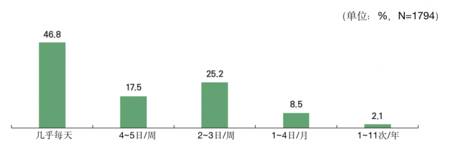 游戏频率方面,几乎每天都玩的用户最多,达到了46.8%,其次是2~3日/周25.2%,4~5日/周17.5%。