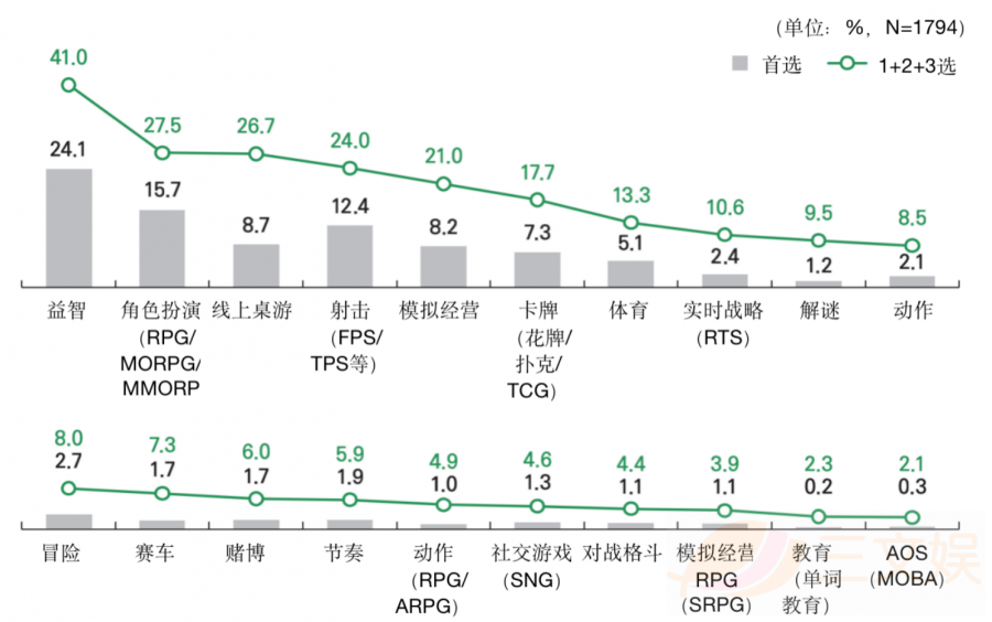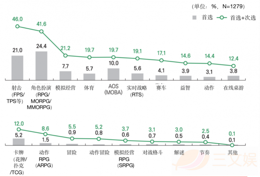 游戏题材方面,24.4%的用户喜欢玩角色扮演类的游戏,其次是射击(21.0%),AOS(10.0%)。从性别区分上来看,女性用户更青睐于“模拟经营”、“赛车”、“解谜”、“线上桌游”等游戏;但随着年龄的降低,更多的女性用户则倾向于“射击”和“AOS”。而男性用户则倾向于“射击”、“角色扮演”、“实时战略”类游戏。