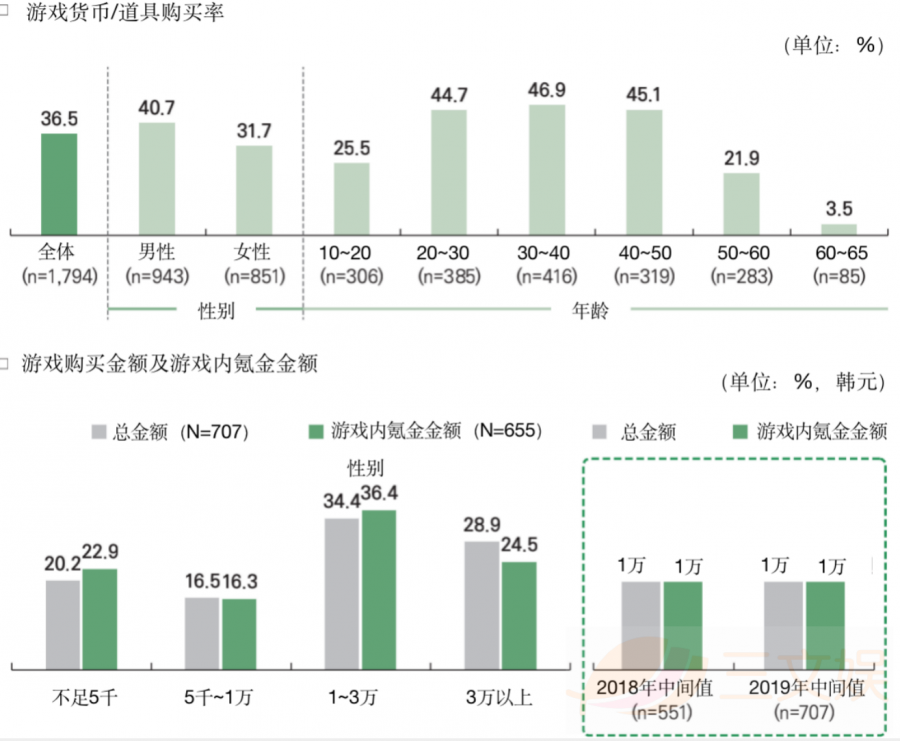 从年龄分布来看,30~40岁的用户最高为46.9%,其次是20~30岁(44.7%)、40~50岁(45.1%)。34.4%的用户在购买游戏中消费1~3万韩元,36.4%的用户在游戏内氪金1~3万韩元。