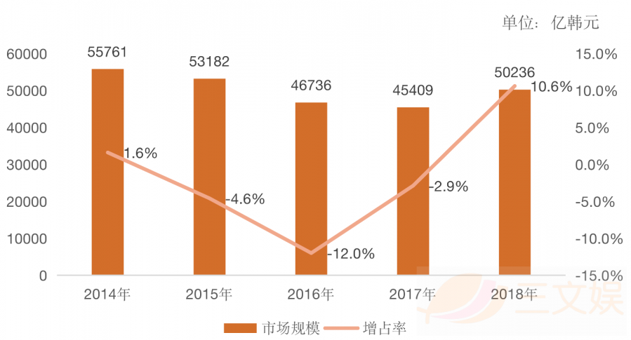 端游市场的规模从2014年起就一直呈现出下滑的趋势,在2016年以-12%的负增长率达到谷底后开始反弹,到了2018年又以10.6%的增长率快速回温,但依旧没能达到2014年近5.58兆韩元的规模。