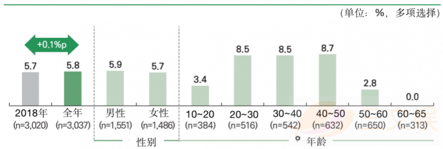 VR游戏方面,用户利用率为5.8%,相较于2018年增加了0.1%p。从性别区分上来看,和传统街机游戏一样没有太大的差异性,男性用户的使用率为5.9%,女性用户为5.7%。从年龄分布上来看,主要集中于20~50岁的成年人中,分为别为8.5%、8.5%、8.7%。60岁以上的用户不玩VR游戏。
