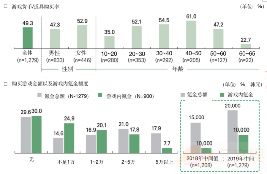 在购买游戏金额及游戏内氪金额度方面,在购买游戏上花费的费用在2~5万区间的人最多为21%,而游戏内氪金费用在不足1万韩元的用户最多为24.9%。
