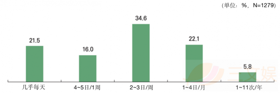 使用频率方面,一周有2~3天在玩游戏的用户最多为34.6%,其次是1个月1~4日22.1%,几乎每天21.5%。