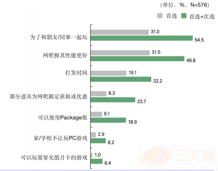 PC游戏方面,除了在家使用家用电脑以外,去网吧玩游戏也是许多人的选择。576位参与调查的用户回答,每周会至少去网吧玩游戏1次。而其主要原因为“为了和朋友/同事一起玩”(31.0%),其次是因为网吧的设备比家里的更好(31.5%)。也有不少人(8.3%)是为了获取网吧限定获取的道具或优惠。