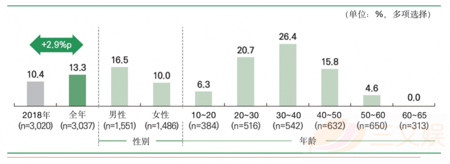 主机游戏的用户利用率由于其需要购买游戏主机,抬高了一定的入门门槛,利用率仅有13.3%,相较于2018年增加了2.9%p。从性别区分上来看,男性用户(16.5%)的利用率明显高于女性用户(10.0%),而从年龄区分上来看,有一定的经济基础的30~40岁的用户使用率最高达到了26.4%,其次是20~30岁(20.7%),40~50岁(15.8%),60岁以上的用户几乎不玩主机游戏。