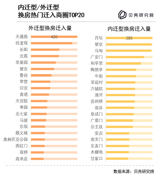贝壳研究院通过分析商圈间换房迁移路径发现,外迁型换房热门迁入商圈包括天通苑、回龙观,长阳等,多属于四环外的商圈;内迁型换房热门迁入商圈有月坛、望京、马甸等,教育资源丰富、周边工作机会多。前二十热门迁入商圈分别占到外迁型和内迁型换房总量的43.2%、31.0%,集中趋势较为明显。