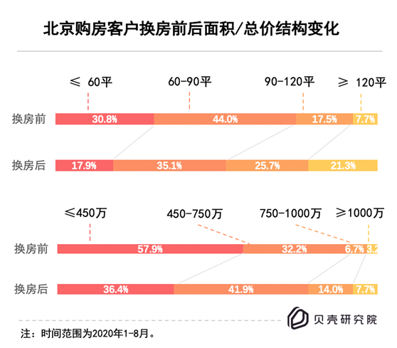 贝壳研究院数据显示,北京换房客户在置换前后总价和面积均有显著增加。总价方面,2020年(1-8月)北京业主置换后的房屋套均总价达到588万,平均每换一套房相较置换前总价增加116万元;面积来看,置换客户换房后套均面积增加18平方米,套均面积达到96平方米,在居住面积上实现了较大的改善。
