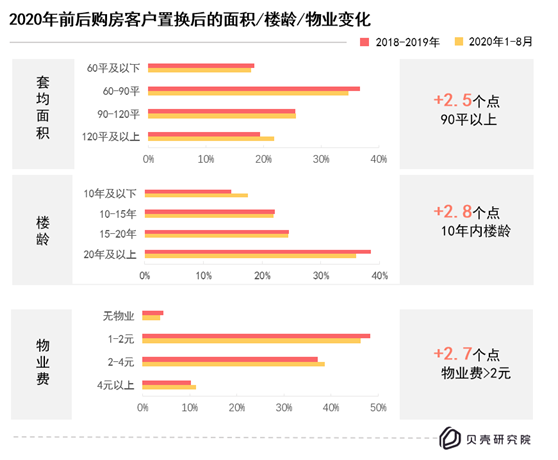 从置换面积看,今年换房客户购买90平方米以上房源占比44.9%,这一比例要比两年前2.5个百分点。从楼龄看,换房客户在今年购买10年内房源占比14.8%,相较两年前高出2.8个百分点。物业方面,换房客户在今年购买品质物业(物业费超过2元/月/平)小区的比例为50%,较两年前高出2.7个百分点。