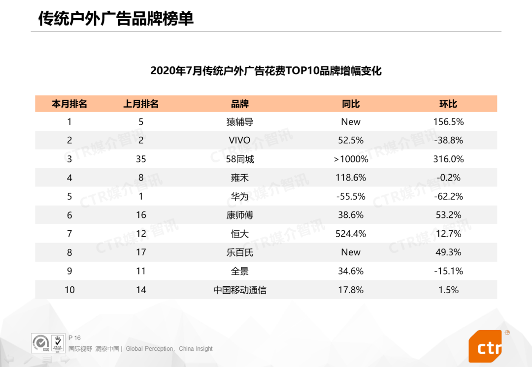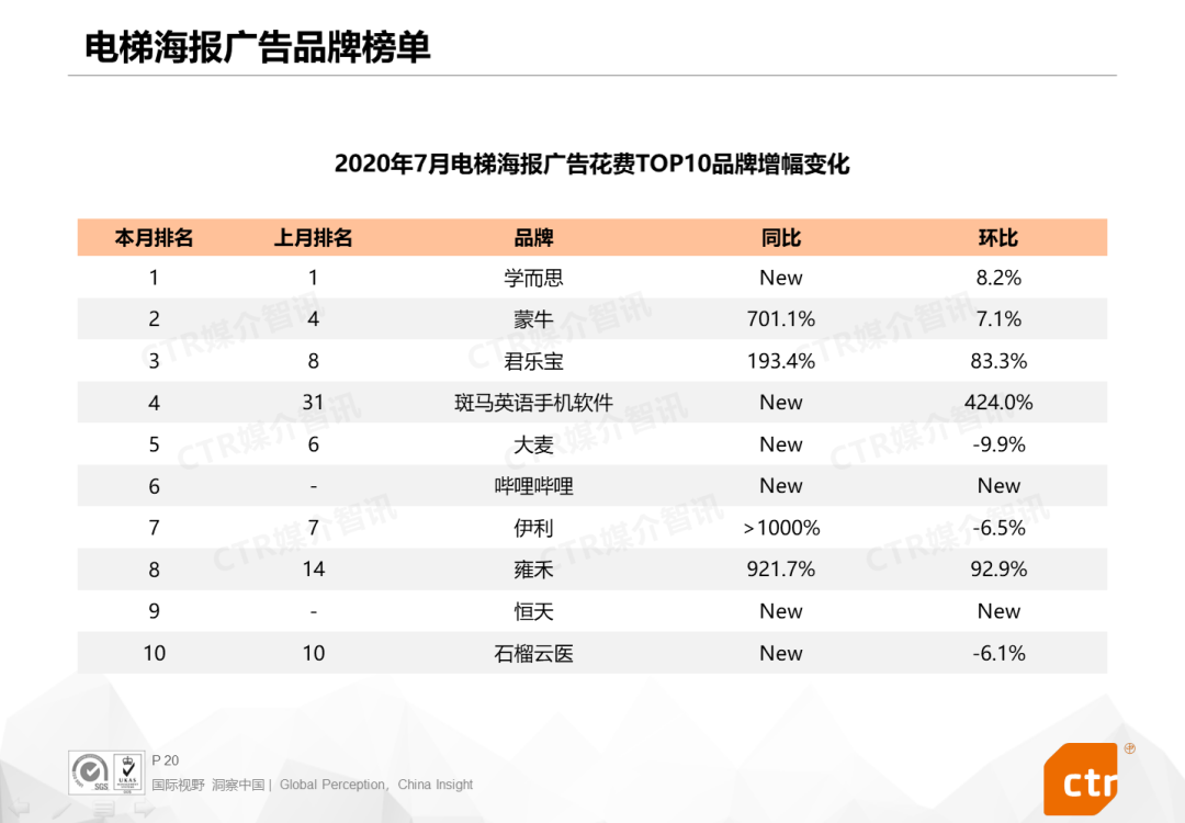 从各广告渠道表现来看,电视、报纸、广播、电梯广告的环比都有进一步增长,电梯广告同比增长超过40%。