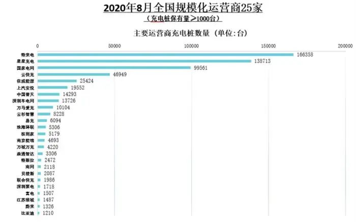 截止到2020年8月,全国充电运营企业所运营充电桩数量超过1万台的共有9家,分别为:特来电运营16.6万台、星星充电运营13.9万台、国家电网运营10万台、云快充运营4.7万台、依威能源运营2.5万台、上汽安悦运营2万台、中国普天运营1.4万台、深圳车电网运营1.4万台、万马爱充运营1万台。这8家运营商占总量的90.3%,其余的运营商占总量的9.7%。