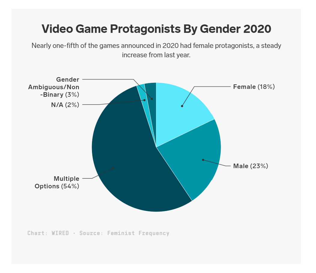 与往常一样,最大比例的游戏(54%)允许玩家在男性和女性角色之间进行选择,或者以一个群体为中心,而不是一个单一的人物。