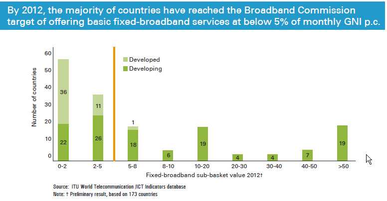 2012年发达国家固网宽带费用占月度人均GNI的比例为1.7%,发展中国家,宽带的费用仍然很高,占平均月收入的30.1%