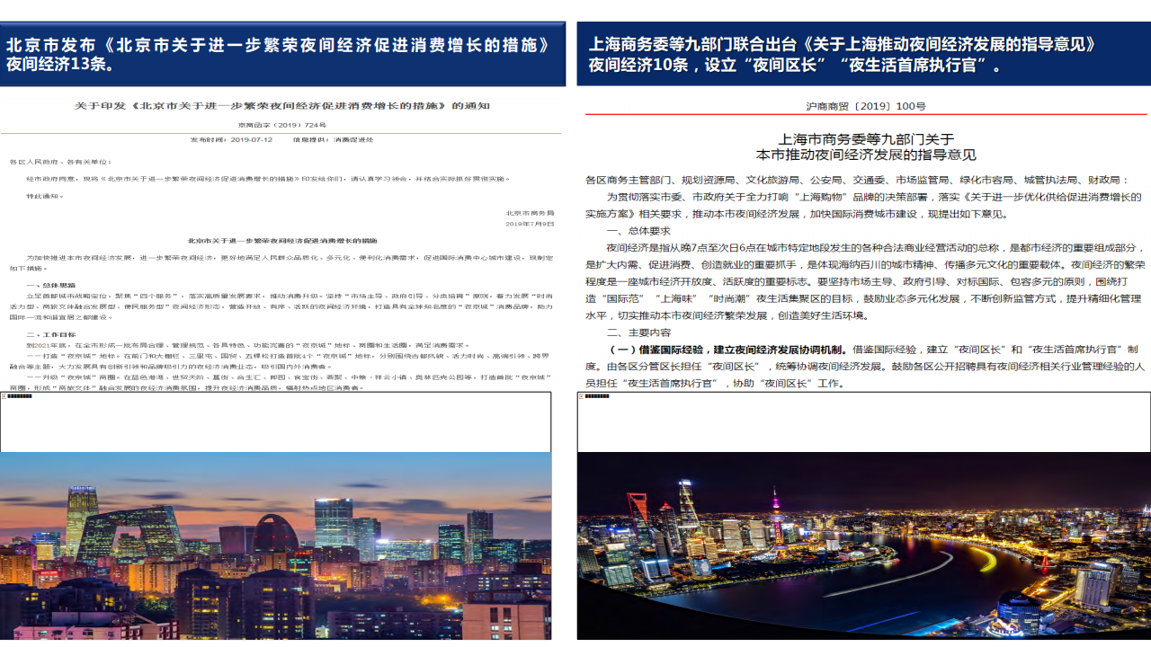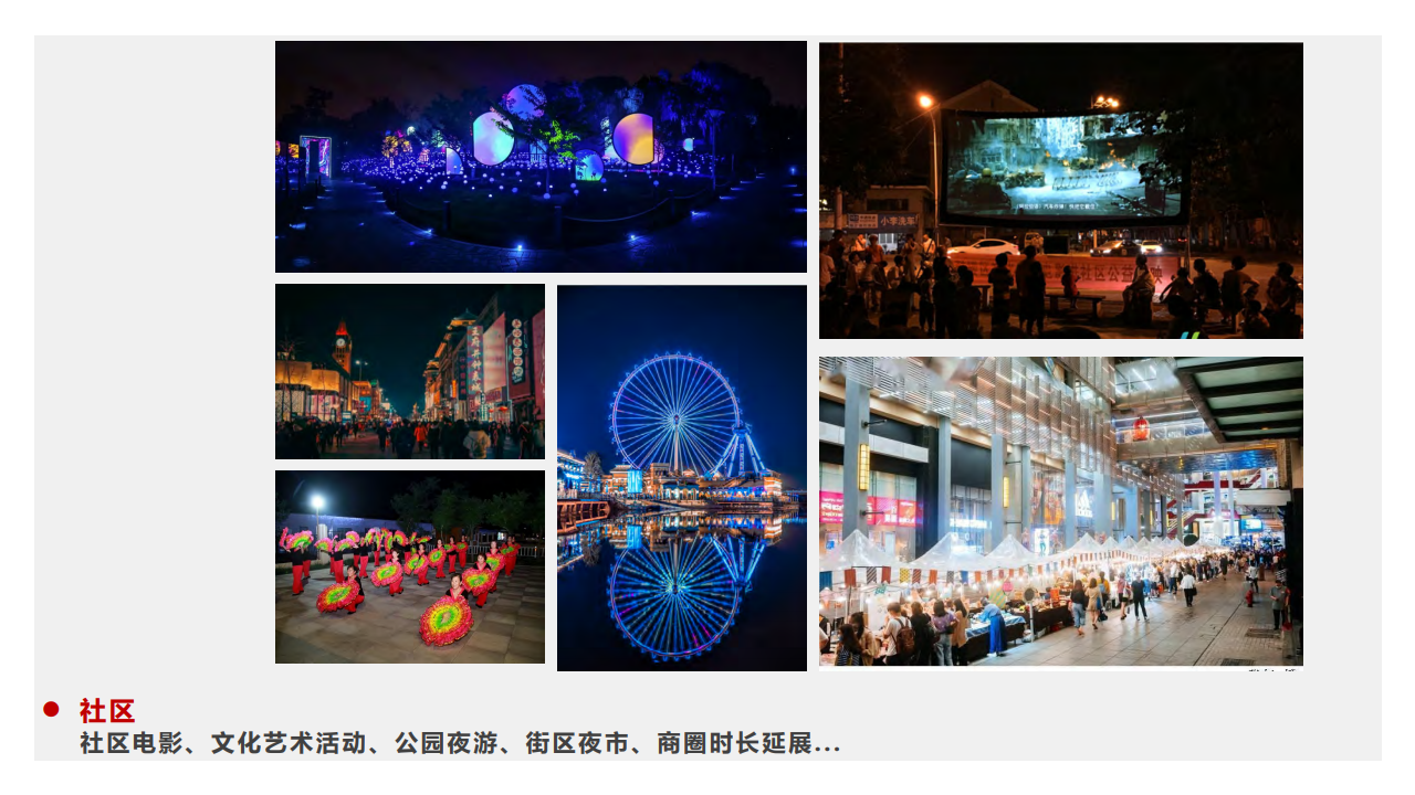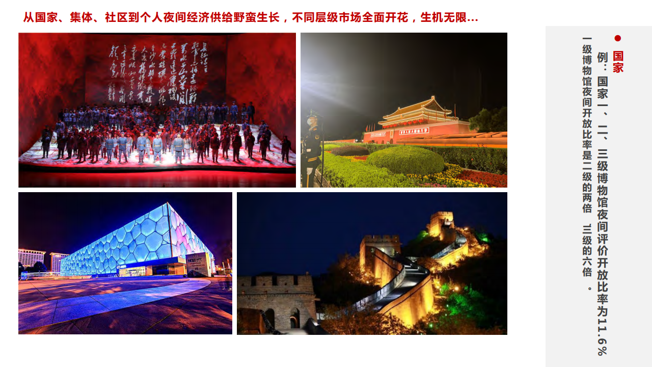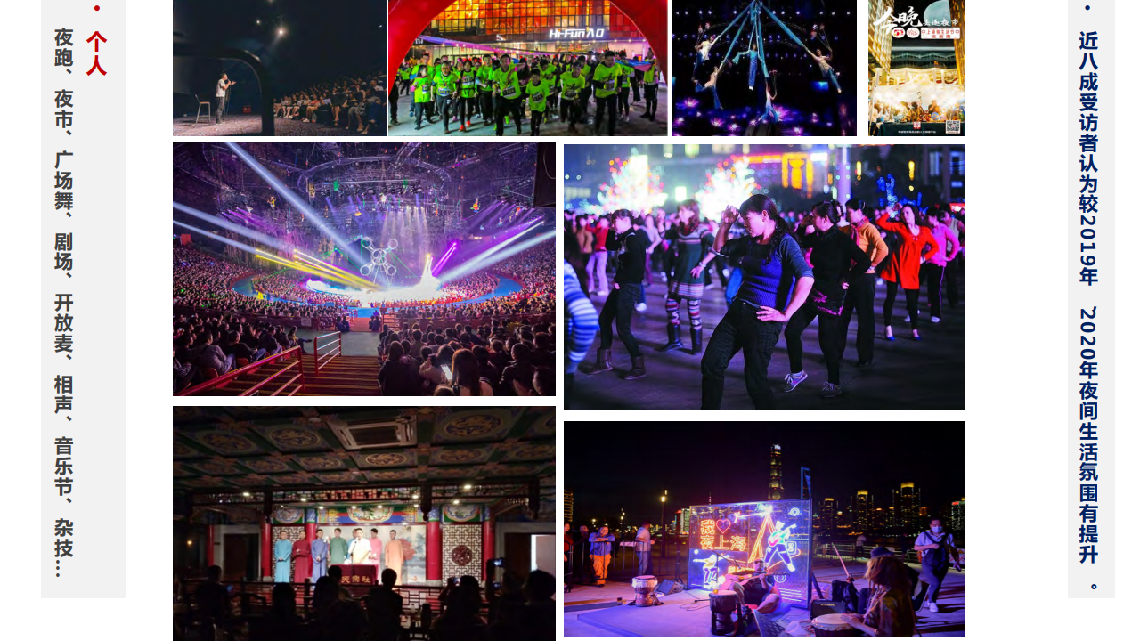从国家、集体、社区到个人夜间经济供给野蛮生长,不同层级市场全面开花,生机无限。从国家层面上来看,如国家一、二、三级博物馆夜间开放比率为11.6%,其中一级博物馆夜间开放比率是二级的两倍,三级的六倍。从集体层面来看,全国AAAAA级景区夜间开放率22.8%;AAAA级夜间开放率20.4%。老场景不断开放,传统景区、文化场馆相继推出夜游,且评级越高开放比率越高。从社区层面来看,社区电影、文化艺术活动、公园夜游、街区夜市、商圈时长延展丰富多彩。从个人角度来看,夜跑、夜市、广场舞、剧场、开放麦、相声、音乐节、杂技等可体验参与的夜间活动越来越多。近八成受访者认为较2019年,2020年夜间生活氛围有提升。 市场主体创新不断,行浸式夜游成亮点。夜游项目品类增多、夜间休闲消费场所增多和数字科技运用广泛是2020夜间游客感知的主要关键词。潮流夜市、文创集市、微演艺、行浸式夜游正在成为城市夜间经济发展的重要“活力因子”;2020年一年潮流集市/文化集市出现近90家。