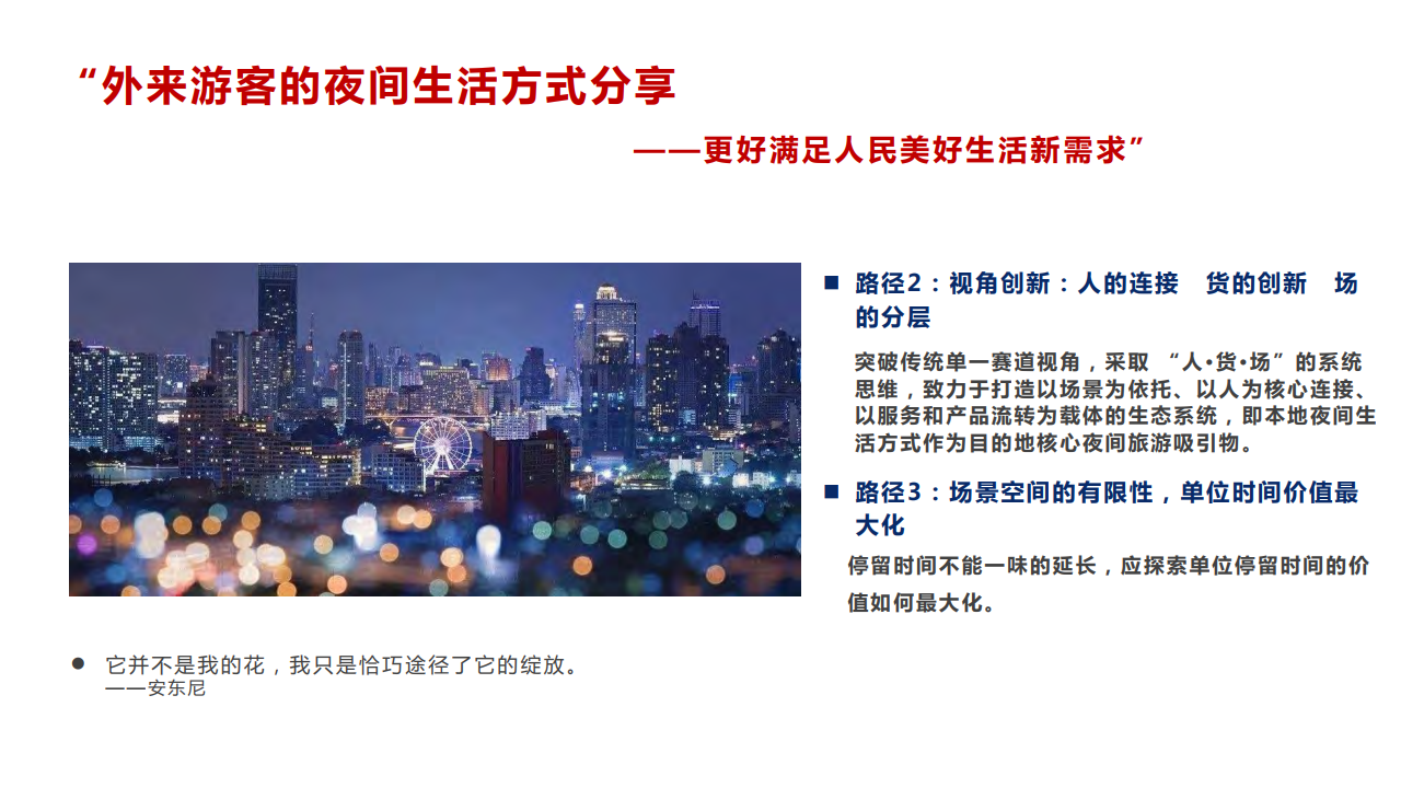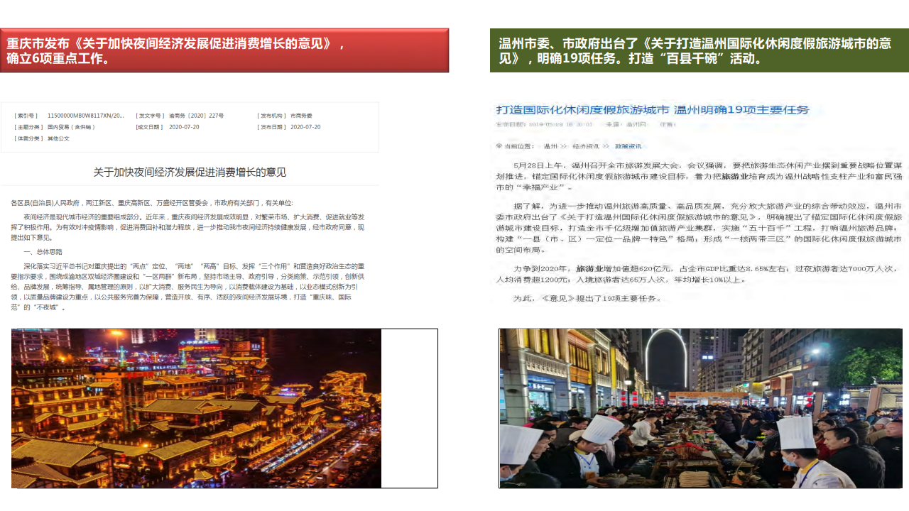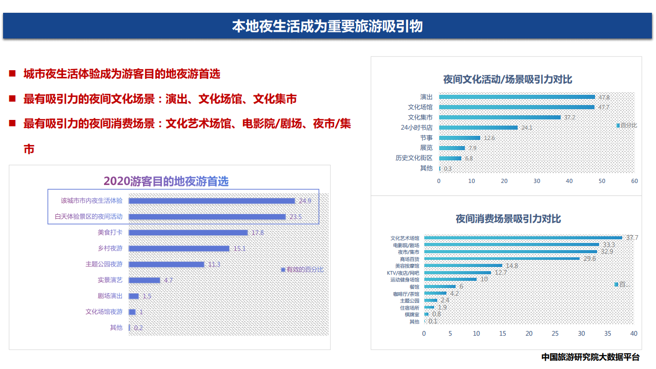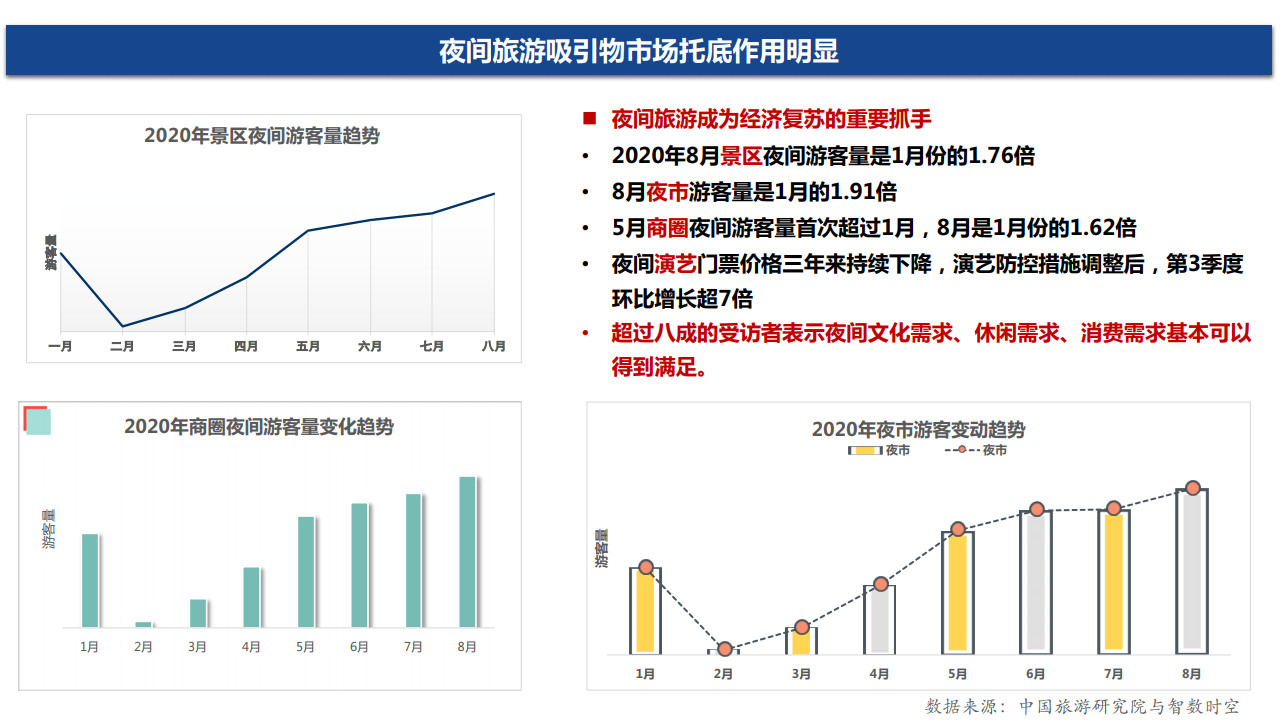 本地夜生活成为重要旅游吸引物,市场托底作用明显。大数据调研显示,城市夜生活体验成为游客目的地夜游首选;演出、文化场馆、文化集市被认为是最有吸引力的夜间文化场景;文化艺术场馆、电影院/剧场、夜市/集市被认为是最有吸引力的夜间消费场景。2020年8月景区夜间游客量是1月份的1.76倍;8月夜市游客量是1月的1.91倍;5月商圈夜间游客量首次超过1月;夜间演艺门票价格三年来持续下降,演艺防控措施调整后,第3季度环比增长超7倍;超过八成的受访者表示夜间文化需求、休闲需求、消费需求基本可以得到满足。