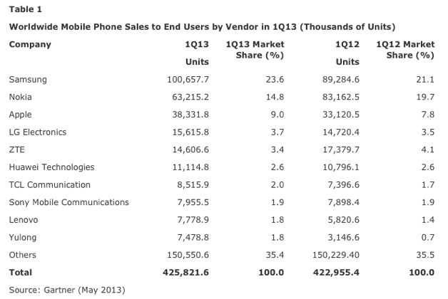 Gartner最近发布报告显示,2013年第一季度全球手机销售达4.258亿部,同比上年仅增长0.7%;其中智能手机达2.1亿部,同比上年增长42.9%。
