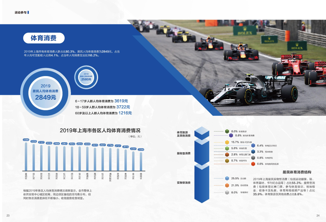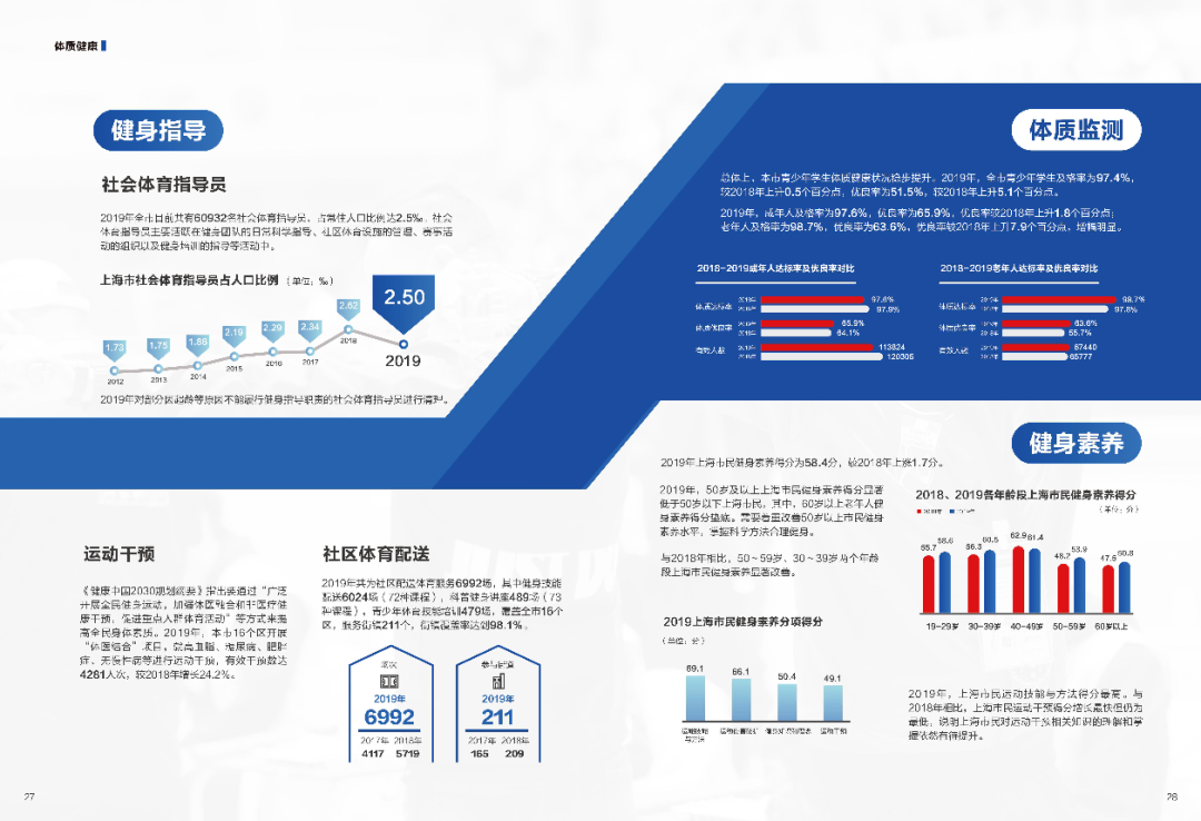 2019年上海市全民健身发展报告 《2019年上海市全民健身发展报告》(简称“300指数”)发布。数据显示,2019年本市全民健身事业总体发展状况令人满意,市民对健身环境的满意度高,经常参与体育锻炼人口比例稳步上升,市民体质健康状况良好。 2019年的300指数总分为256.3分,较上一年度有所提升。 “健身环境”、“运动参与”以及“体质健康”三项组成单项指标均处于“满意”区域。 01、“健身环境”为83.7分,发展总体持稳。 健身环境首先离不开政府保障。2019年,市、区两级政府在全民健身事业上总投入财政经费达15.4亿元。其中,全民健身人均日常工作经费为19.3元,较2018年有小幅增长,主要投入在社区公共场地的建设和维护方面。 “健身环境”部分中,除了政府保障,《报告》还在场地设施、满意度和信息化服务等方面做了数据分析 02、“运动参与”指数在本市体育治理体系改革的不断探索下升至85.7分。 “运动参与”部分分为赛事活动、市民体育锻炼行为、体育健身组织、体育参与比例和体育消费五个方面。 赛事活动——城市业余联赛 近年来,本市体育行政管理部门通过消除市场开放壁垒,海纳百川开门办赛,积极调动社会主体参与赛事的主观能动性。城市业余联赛品牌溢出效应明显,赛事库不断扩容,2019年共计开展赛事活动近6000场,参赛人数达330万余人次。城市业余联赛创办三年来坚持社会化办赛,打造开放平台,广泛吸纳符合办赛标准的赛事项目,开展专业培训,不断提高办赛主体专业水平,吸引共计160家企业和社会团体参与办赛,同比增长约三成。 2019年,本市经常参加体育锻炼的人数占常住人口比例达到43.7%。与2018年相比,19-39岁、50-59岁等年龄段市民经常参加体育锻炼人口比例显著增长,成为市民经常参加体育锻炼人口比例增长的主要推动力。 03、“体质健康”指数为86.9分,总体发展令人满意。 健身指导、体质监测、健身素养是“体质健康”部分的重要内容 04、《2019年上海市全民健身发展报告》由上海市体育局委托第三方上海体育学院公共体育服务研究中心承担评估工作。报告最后也提出了引领体育公共服务提档升级的发展对策: 一是要优化布局,丰富市民身边的健身设施。 二是要智慧先行,满足市民多元化的健身需求。 三是要融合发展,构建健康上海建设新格局。 更多阅读:国家卫健委:2025年国民体质合格率达84.9% 优良率提升至30.9%2019上半年上海市集成电路产业销售收入合计为586.65亿元 同比增长12.9%上海市人社局:上海市青年就业状况报告(2019)上海市产业地图国家统计局上海调查总队:2013年上海市农村居民家庭生活消费支出人均13425元上海市通信管理局:2023年将新建5G基站1万个 5G网络流量占比超60%上海市新闻出版局:2013年上海市青少年阅读状况调查分析报告第一网贷:2015年10月份上海市P2P网贷成交额236.96亿元,全国排名第三2014年Q1-Q3上海市电子商务实现交易额9066亿元 同比增长28.1%CNNIC:2012年上海市互联网络发展状况报告CCAGM&冯氏集团:2019-2020年中国百货零售业发展报告亚洲金融发展报告:普惠金融篇美团:2022米粉品类发展报告2019年云南省咖啡产业发展报告2018-2020年金盾榜发展报告