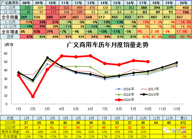 2020年10月累微卡销量56.58万台,累计增速10.6%;10月销量6.54万台,同比增长16.5%,环比增长12.5%。。