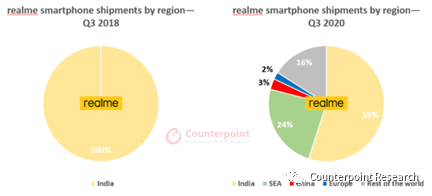 图2:realme各地区智能手机出货量占比:Q3 2018 vs. Q3 2020