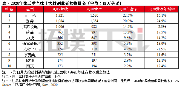 根据TrendForce集邦咨询旗下拓墣产业研究院表示,自第二季起受惠于疫情衍生的宅经济效应,终端需求持续上扬,加上9月15日起美国全面禁售相关含美设备与技术芯片给华为(Huawei),进而带动多数封测业者赶在截止日前交货。在急单效应的加持下,2020年第三季全球前十大封测业者营收上升至67.59亿美元,年成长12.9%。