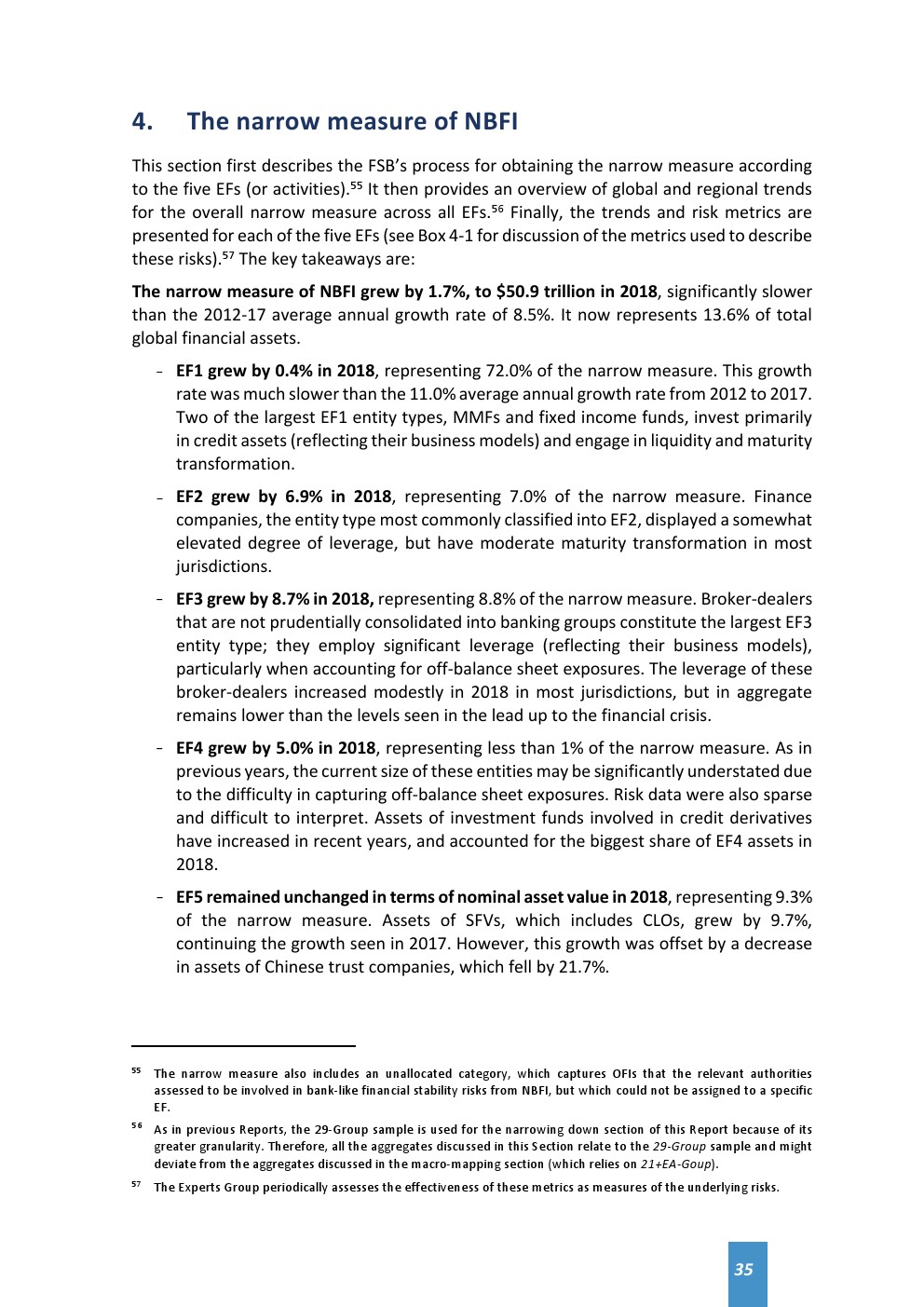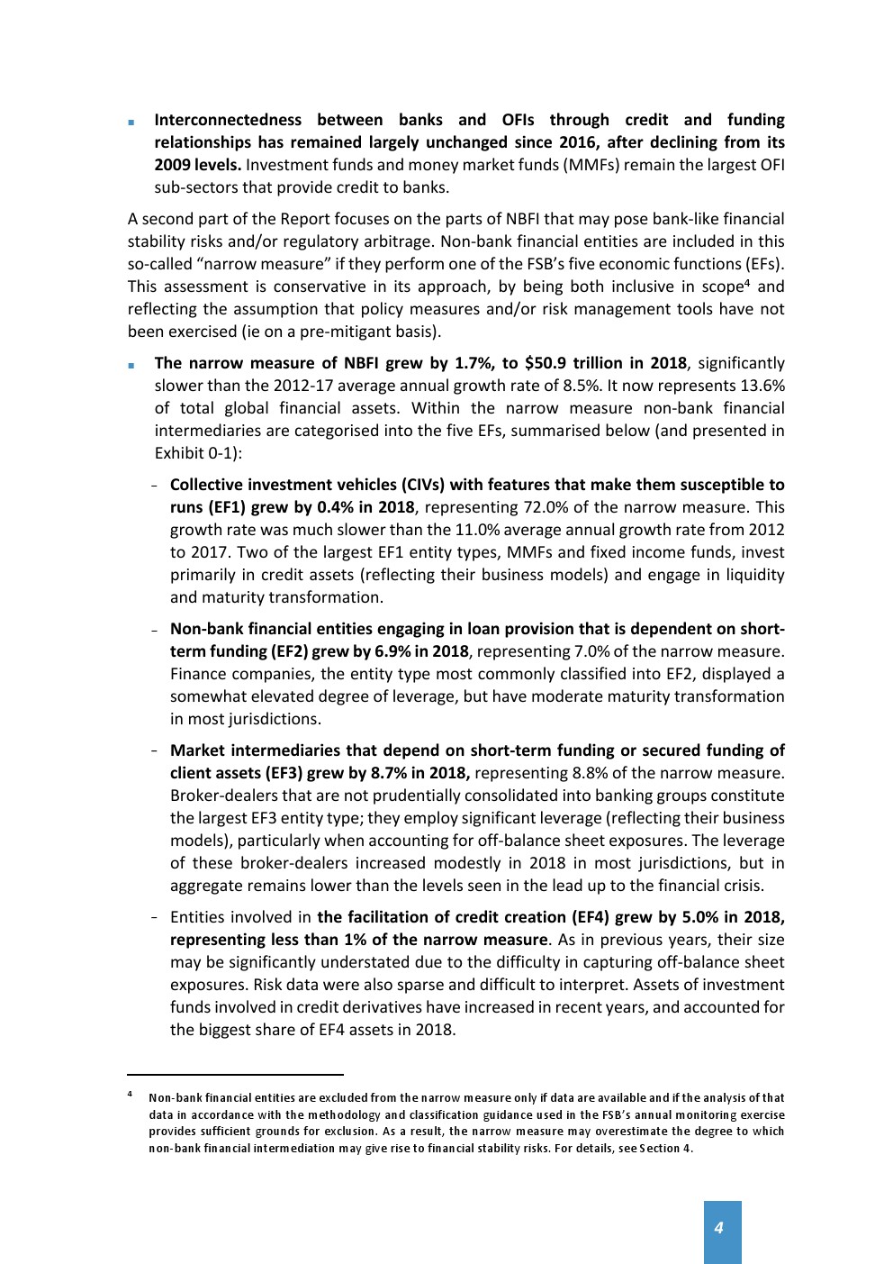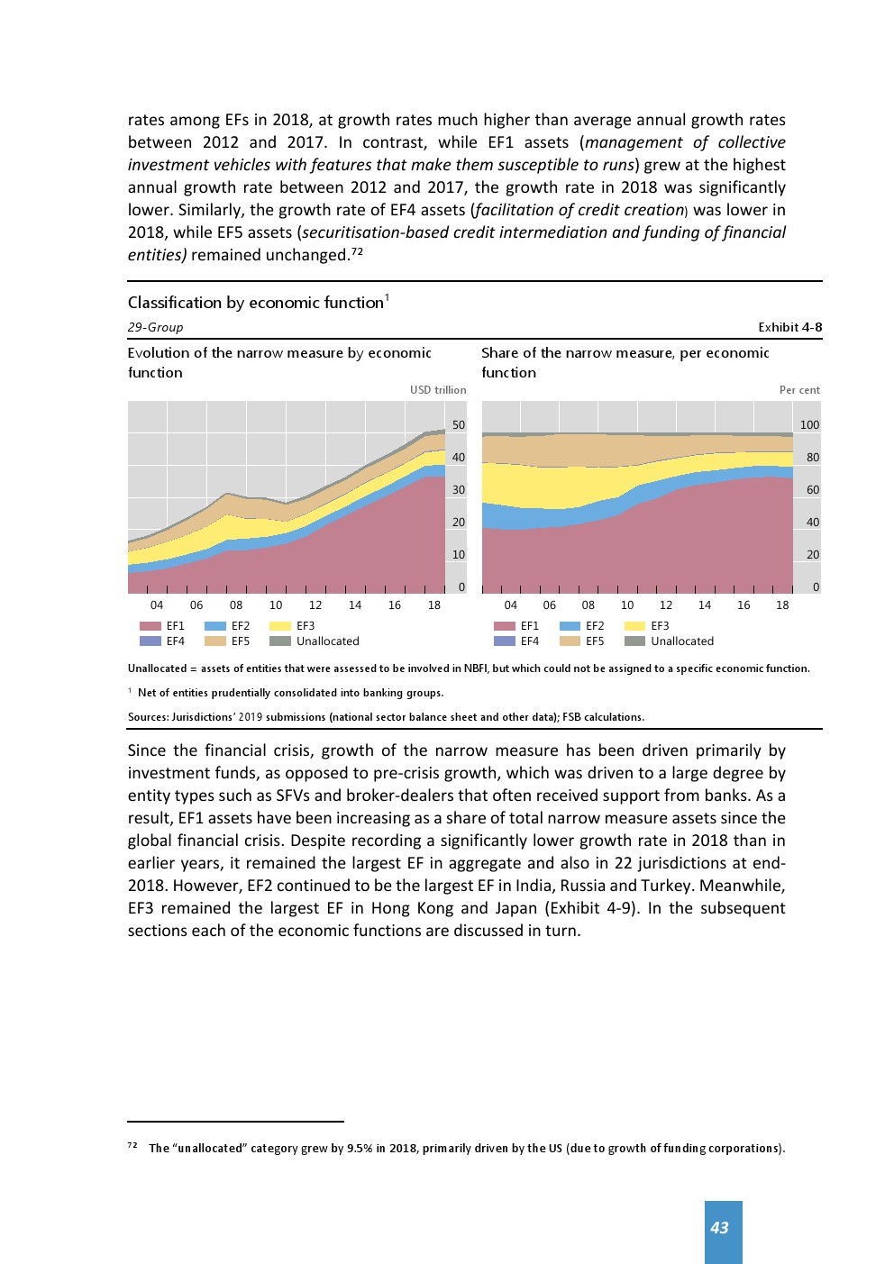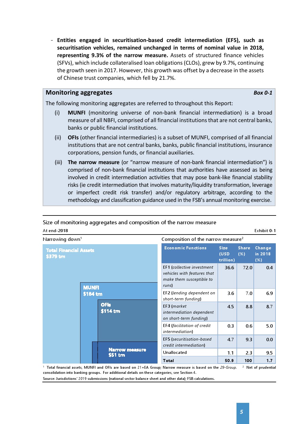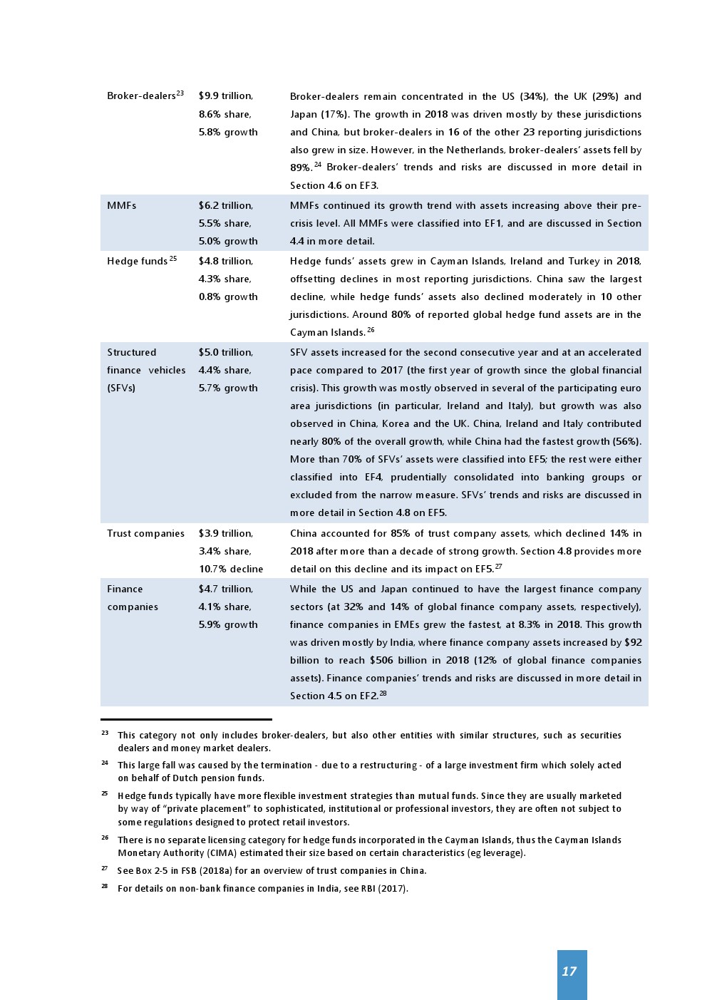 NBFI(非银行金融中介,从事类银行金融活动的机构)增长了1.7%,2018年达到50.9万亿美元,远低于2012-17年度8.5%的平均年增长率。现在,它占全球金融资产总额的13.6%。在狭义范围内,非银行金融中介机构分为五个EF: