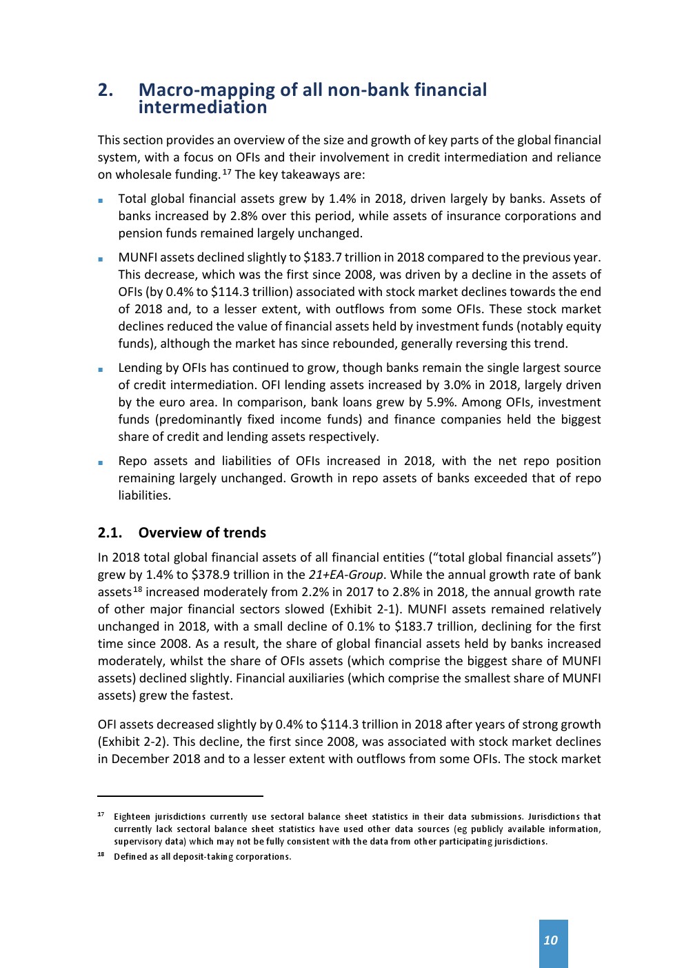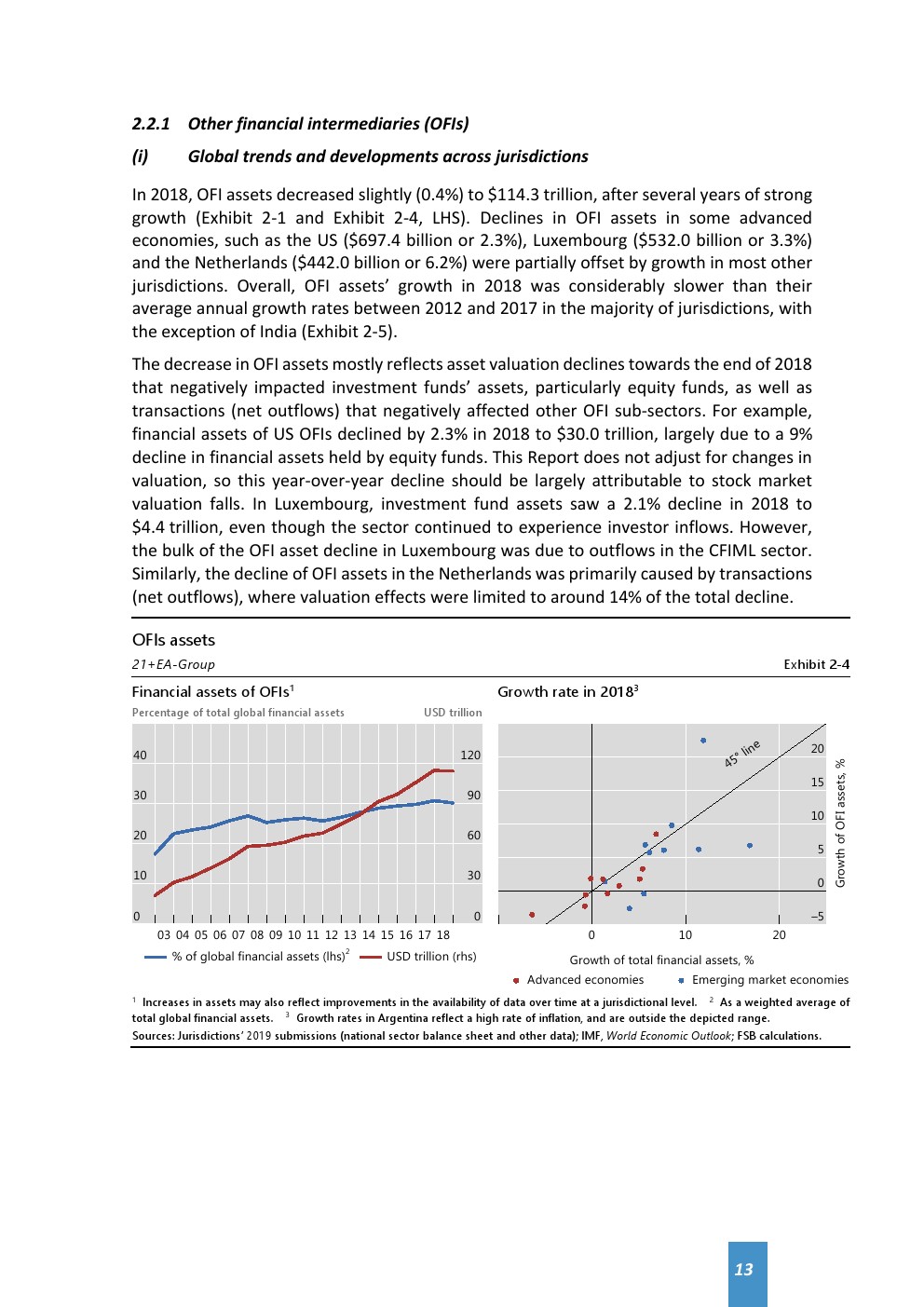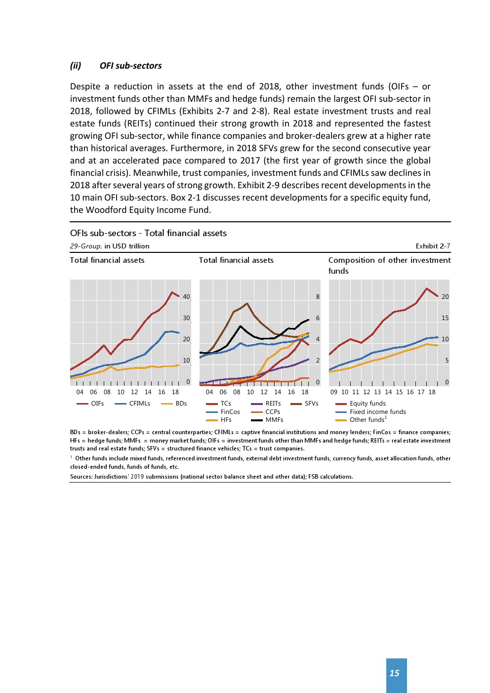 2018年MUNFI(非银行金融中介资产)与前一年相比略有下降,降至183.7万亿美元。这是自2008年以来的首次下降,其原因是2018年底股市下跌导致OFI(其他金融中介)资产下降0.4%,降至114.3万亿美元。股市下跌使投资基金(尤其是股票基金)持有的金融资产的价值下降,尽管此后市场已经反弹,总体上扭转了这一趋势。