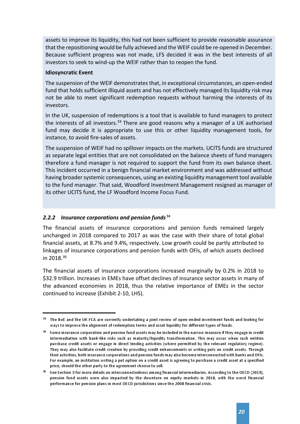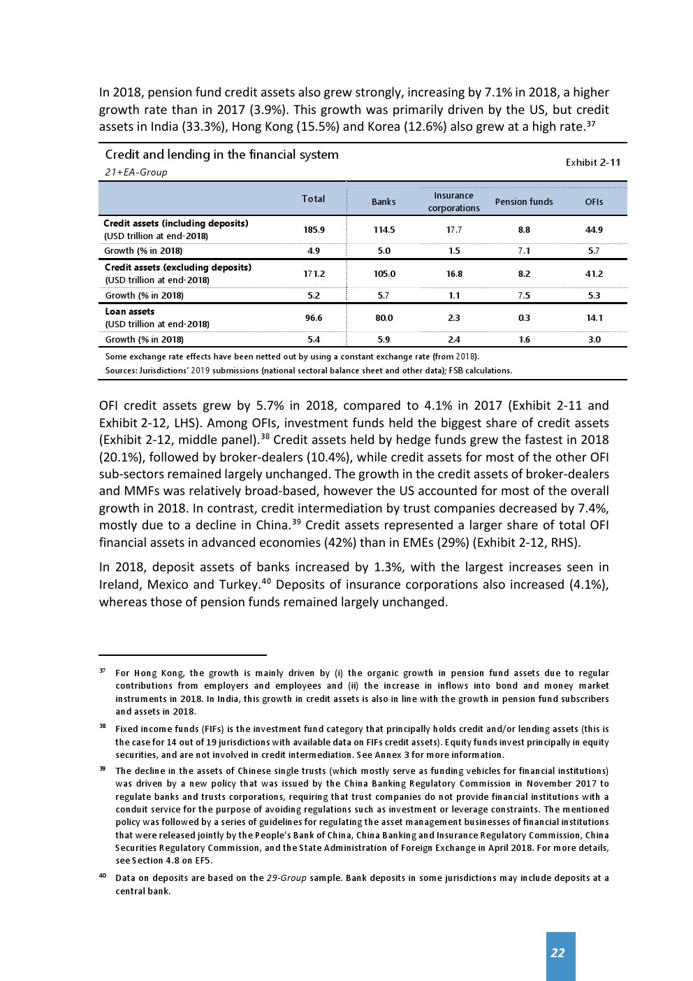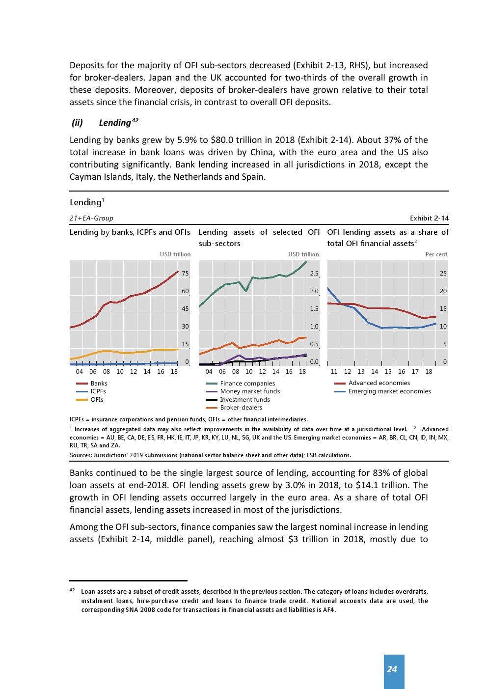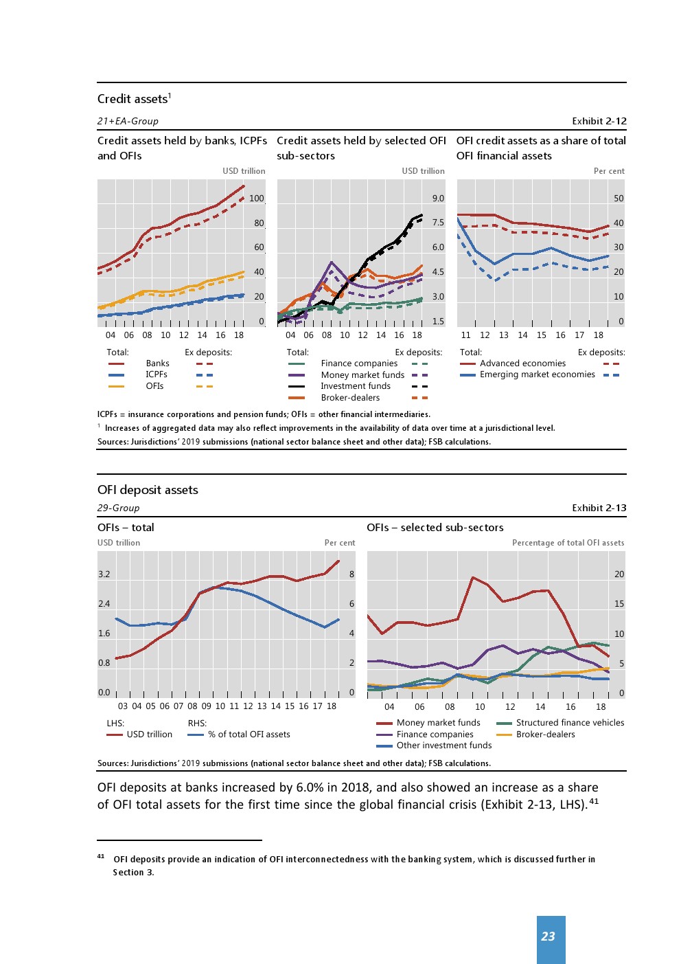 尽管银行仍然是信贷中介的最大单一来源,但OFI的贷款仍在继续增长。OFI贷款资产在2018年增长了3.0%,主要受欧元区推动。相比之下,银行贷款增长了5.9%。在OFI中,投资基金(主要是固定收益基金)和金融公司分别占信贷和借贷资产的最大份额。
