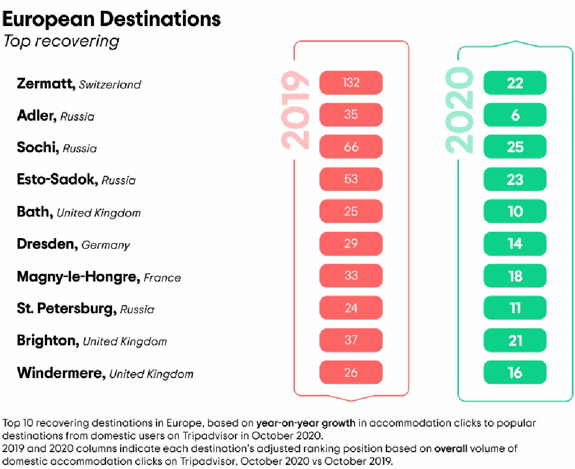 人们的目的地选择也在改变。滑雪和海滨度假胜地以及其他乡村旅游目的地是欧洲恢复速度最快的旅游目的地,瑞士的采尔马特和俄罗斯的阿德勒排名第一。