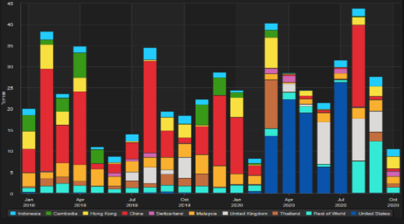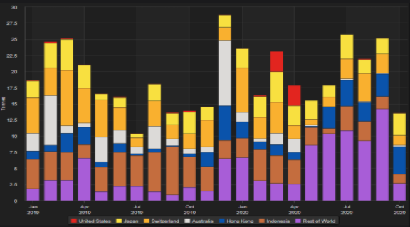 2020年,新加坡主要从柬埔寨进口黄金。但近几个月来,从柬埔寨进口的黄金有所下降,10月份下降70%,至略高于1吨,为4月份以来最低水平。