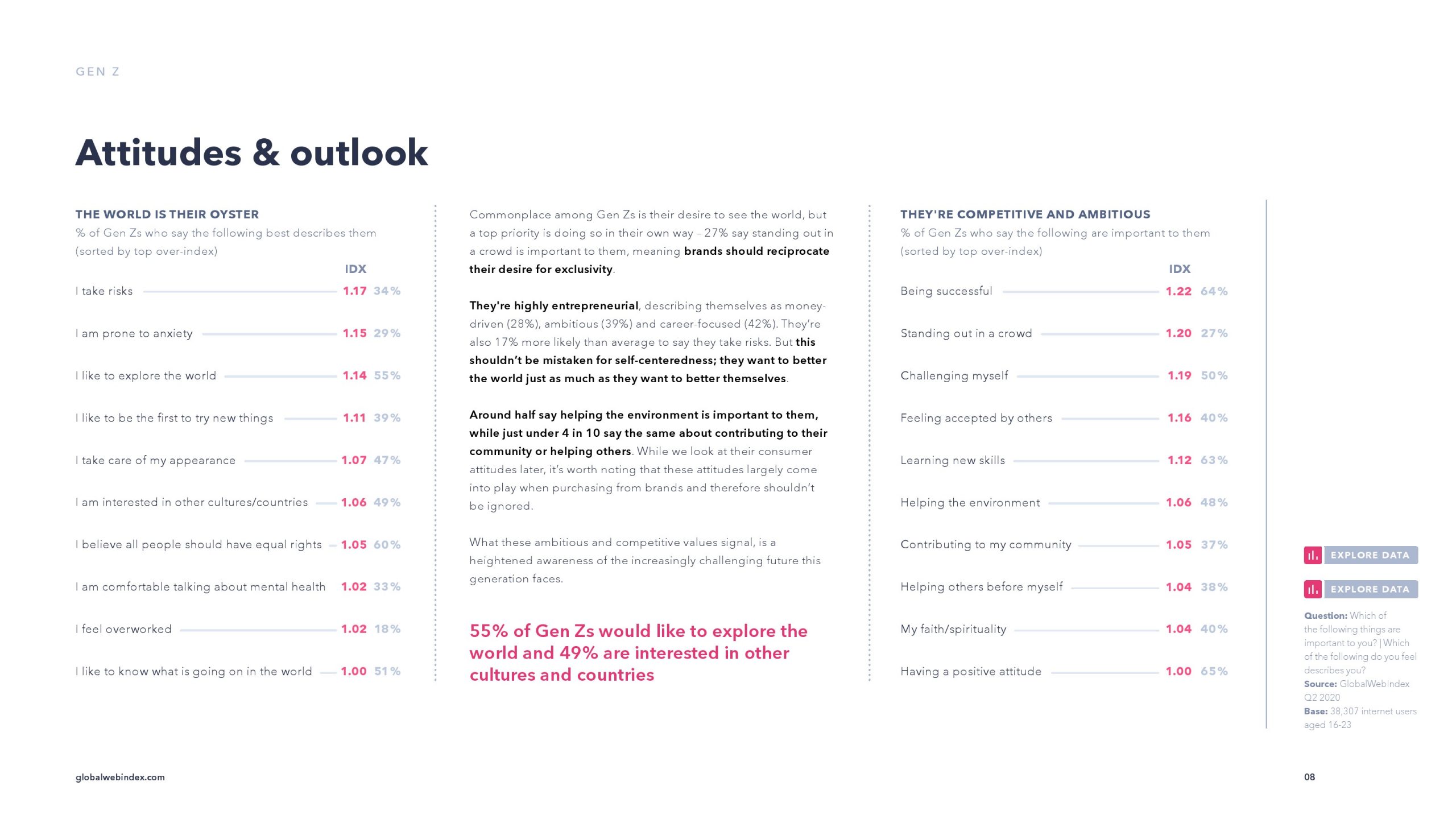 许多Z世代都是高度驱动和无私的。他们称自己雄心勃勃、专注于事业,愿意冒险的可能性比平均水平高出17%。大约一半的受访者表示,环境对他们很重要,4/10的受访者对社区贡献或帮助他人也持相同的看法。