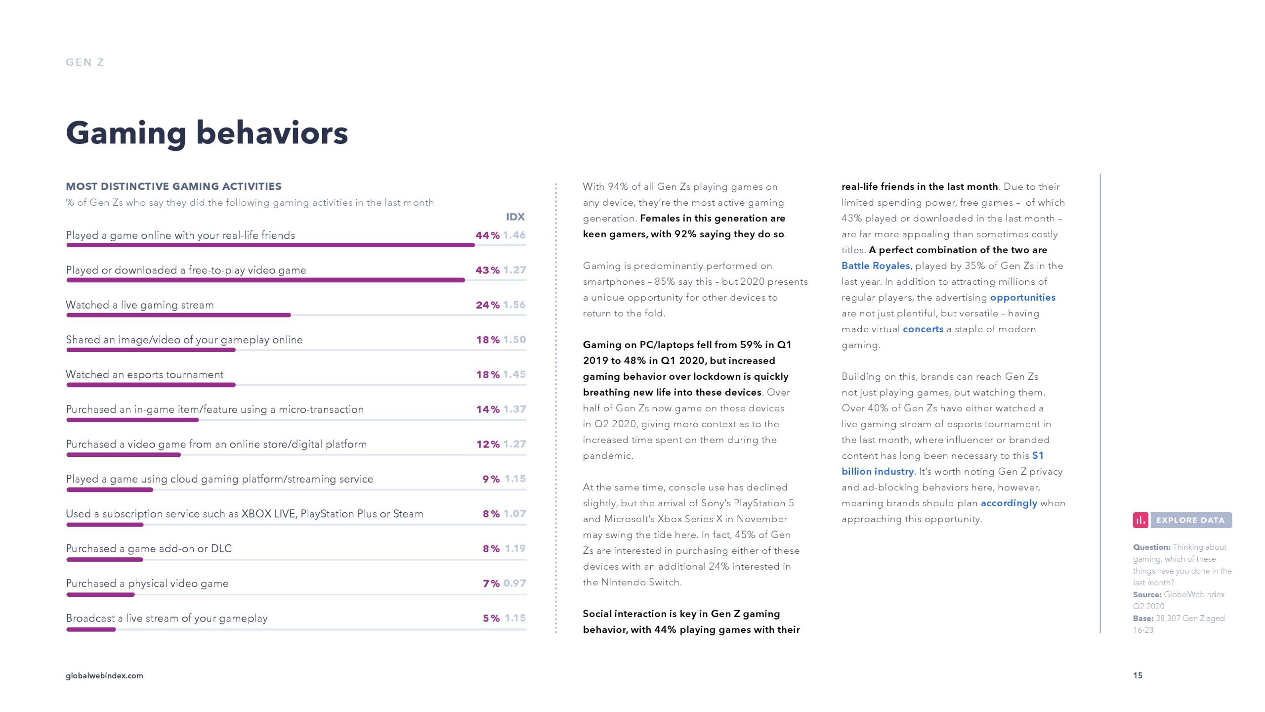 94%的Z世代在各种设备上玩游戏,他们是最活跃的游戏玩家。社交游戏是Z世代的关键,44%的受访者在上个月与现实生活中的朋友玩游戏。但是,由于消费能力有限,,其中43%的受访者在上个月玩过或下载过免费游戏,这比昂贵的游戏更具吸引力。