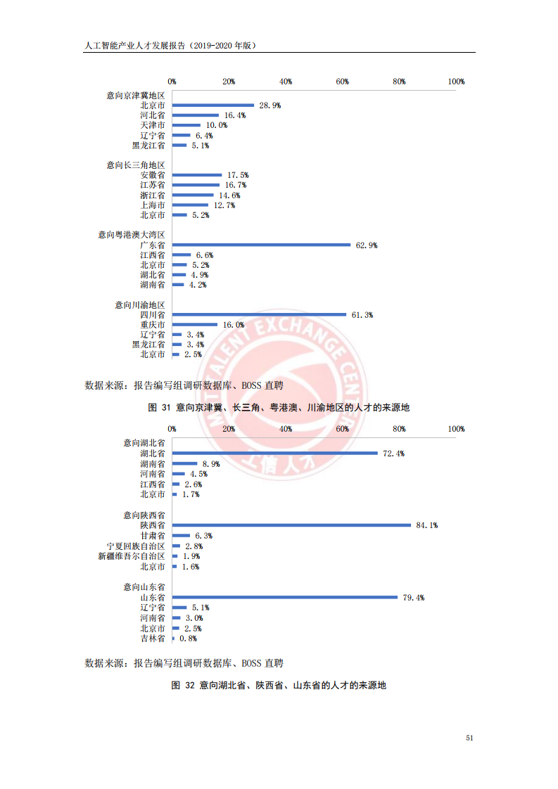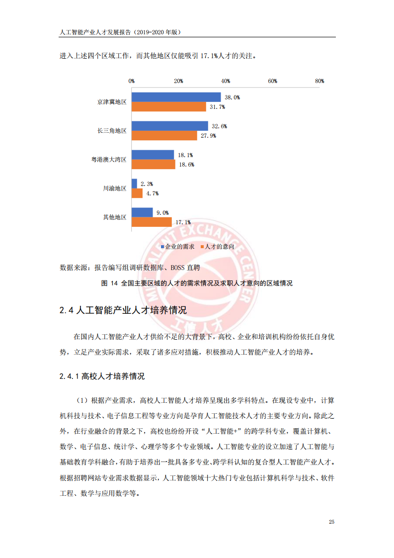 当前人工智能产业人才供需比严重不平衡主要表现在以下三方面:一是不同类型的岗位供需不平衡,当前企业对算法研究岗、应用开发岗和实用技能岗等技术型岗位的人才需求最为旺盛,分别占整体需求岗位的12.2%、19.8%和34.8%,但其人才供需比分别仅为0.13、0.17和0.98;二是不同的技术方向供需不平衡,机器学习和计算机视觉在现阶段的人才需求最为突出,在整体需求岗位中的占比分别为39.1%和33.4%,但相关技术方向的人才极度稀缺,人才供需比仅为0.23和0.09,有效供给严重不足;三是不同区域人才供需不平衡,京津冀地区、长三角地区、粤港澳大湾区和川渝地区是当前人工智能产业的主要发展高地,同时也是人工智能产业人才资源的主要聚集地,人才需求规模占全国总需求的90.9%,人才供给规模占全国总供给的82.9%。