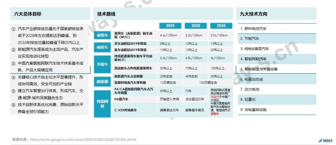 - 10月27日,2020中国汽车工程学会年会暨展览会上《节能与新能源汽车技术路线图(2.0版)》正式发布,2.0版技术路线图以六大总体目标为指导,明确了九大技术方向,分别以2025年、2030年、2035年为关键节点,设立了产业总体发展里程碑,意在建立自主、可控的产业链。