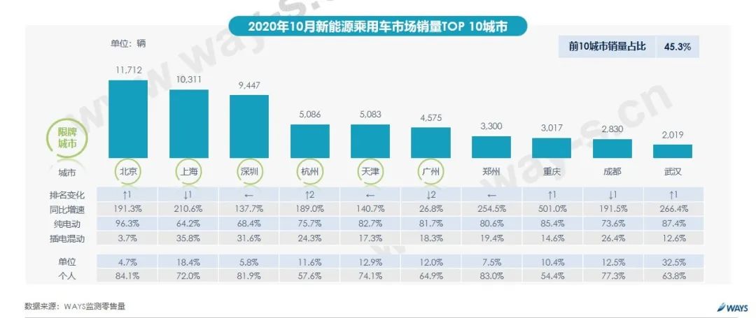 - 10月,前10城市销量占比为45.3%;限牌城市销量排名靠前,北京、上海销量破万,继续领跑,武汉排名上升1位,跻身第十。