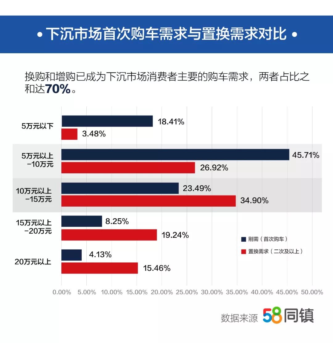 58同镇《下沉市场汽车消费趋势报告》还反映出,下沉市场用户具有较大的汽车购置需求。其中,换购和增购车需求分别占比43%和27%,不少用户希望通过置换和添置的方式,使汽车实现更新换代。在价格上,34.9%的下沉市场消费者希望置换10-15万元价格区间的汽车,占比排名第一。此外,下沉市场的已购车用户车辆使用时间平均为4年以下,预计换车周期集中在6年以上。可见,未来2年内,下沉市场的汽车置换需求将集中爆发。