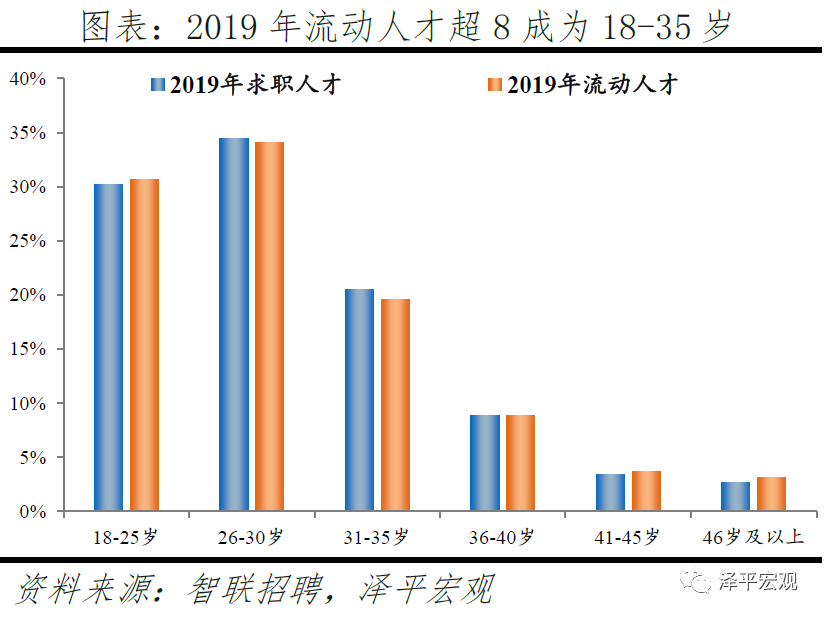 2)从年龄看,流动人才中超8成为18-35岁。2019年求职人才中18-25岁、26-30岁、31-35岁、36-40岁、41-45岁、46岁及以上分别占比30.2%、34.5%、20.5%、8.8%、3.4%、2.6%;流动人才中各年龄段人才分别占比30.7%、34.1%、19.6%、8.8%、3.7%、3.1%,求职人才和流动人才的年龄结构较为吻合,18-35岁分别占比85.1%、84.4%,而在2018年上述比例分别为86.1%、78.6%,2019年流动人才更加集中于18-35岁。