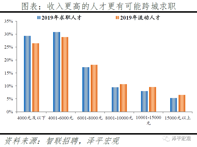 5)从工资水平看,流动人才中45%月收入超6000元,明显高于求职总体的40%,收入较高者更有可能跨城求职。求职人才中月收入4000元及以下、4001-6000元、6001-8000元、8001-10000元、10001-15000元、15000元以上分别占比29.3%、30.8%、17.2%、9.4%、8.0%、5.3%,流动人才中各收入人才分别占比26.4%、28.8%、18.1%、10.6%、9.6%、6.5%,其中6000元以上的分别占比39.9%、44.8%,而在2018年上述比例分别为39.9%、45.8%,说明收入更高的人才更有可能跨城求职。