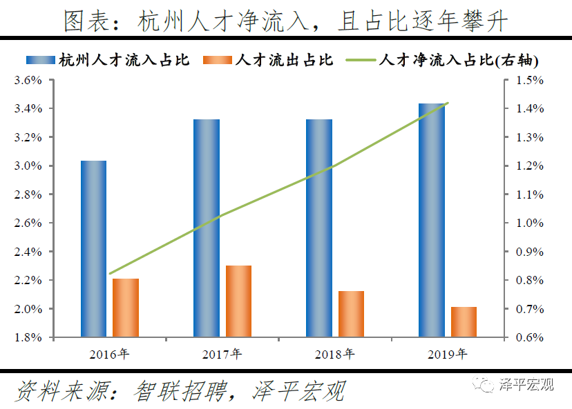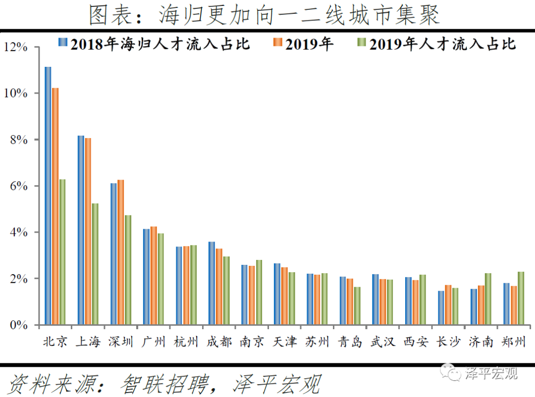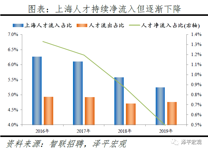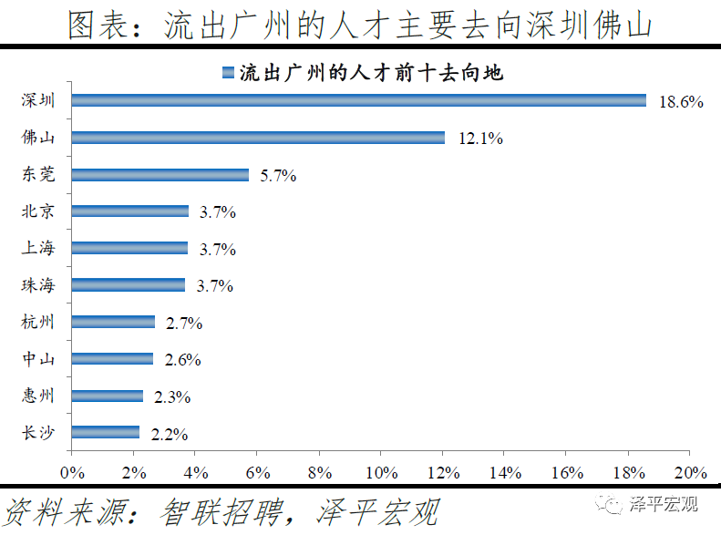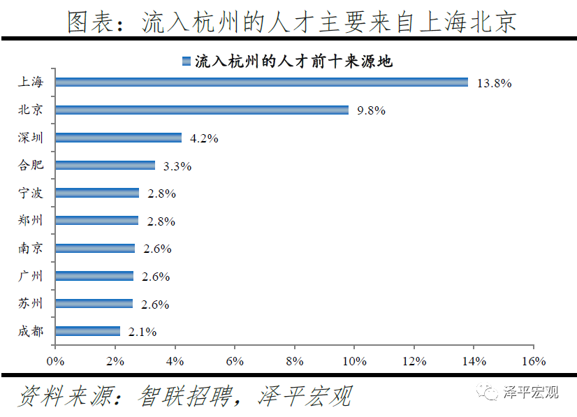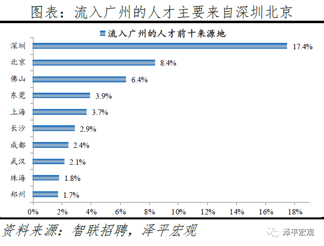 3)深圳:2016-2019年人才净流入占比分别为-0.2%、0.1%、0.4%、0.2%,主因深圳经济发展速度较快、人才政策有吸引力;深圳和广州互为人才外流第一目标城市,深圳流向广州和广州流向深圳的人才流出在全国流动人才总量中占比分别为0.7%、0.6%,规模基本平衡。2015年深圳常住人口增量从2014年的15万大幅上升至60万,2015-2018年平均增量为56万。2016-2019年深圳人才流入占比基本稳定在4.9%左右,分别为4.8%、5.1%、5.0%、4.7%,但人才流出占比呈下降趋势,分别为5.0%、4.9%、4.6%、4.6%。从来源看,人才向深圳流入的前十大城市分别为广州、北京、天津、东莞、上海、成都、长沙、武汉、惠州、佛山,合计占比达52.8%,高于2018年前十来源地的50.4%,深圳的人才来源集中度有所提高。其中,珠三角城市有4个,占比22.9%;流入深圳的人才中13.1%来自广州,流入广州的人才中17.4%来自深圳,深圳和广州互为人才来源城市的第1位。人才流入深圳主要因为经济发展速度相对较快和人才政策有吸引力。2019年深圳GDP增速6.7%,高于全国平均的6.1%,也高于北京和上海的6.1%、6.0%;2016-2019年深圳平均GDP增速为8.0%,高于广州、北京、上海的7.0%、6.6%、6.6%。深圳还拥有华为、腾讯、平安等众多著名企业,尤其是互联网企业,吸引大量人才。深圳的落户政策逐渐放宽,且补贴幅度较大,根据深圳市人力资源和社会保障局数据,2016年深圳将全日制本科生、硕士、博士的租房相关补贴从6000、9000、12000元分别提高至15000、25000、30000元,2017年落户门槛放宽至35岁以下专科学历人才,对新引进的两院院士和杰出人才、地方级领军人才、后备级人才分别给予300万、200万、160万的奖励。从去向看,深圳人才外流的前十大城市分别为广州、东莞、上海、北京、惠州、佛山、长沙、杭州、武汉、成都,合计占比达53.9%,低于2018年前十去向地的56.4%,深圳人才流向的方向更加分散。其中,广州占比达15.0%,珠三角城市有4所,合计占比32.3%,深圳和珠三角地区人才流动频繁;流出深圳的人才中15.0%流向广州,流出广州的人才中18.6%流向深圳,深圳和广州互为人才外流目标城市的第1位,深圳流向广州和广州流向深圳的人才流出在全国流动人才总量中占比分别为0.7%、0.6%,规模基本平衡。