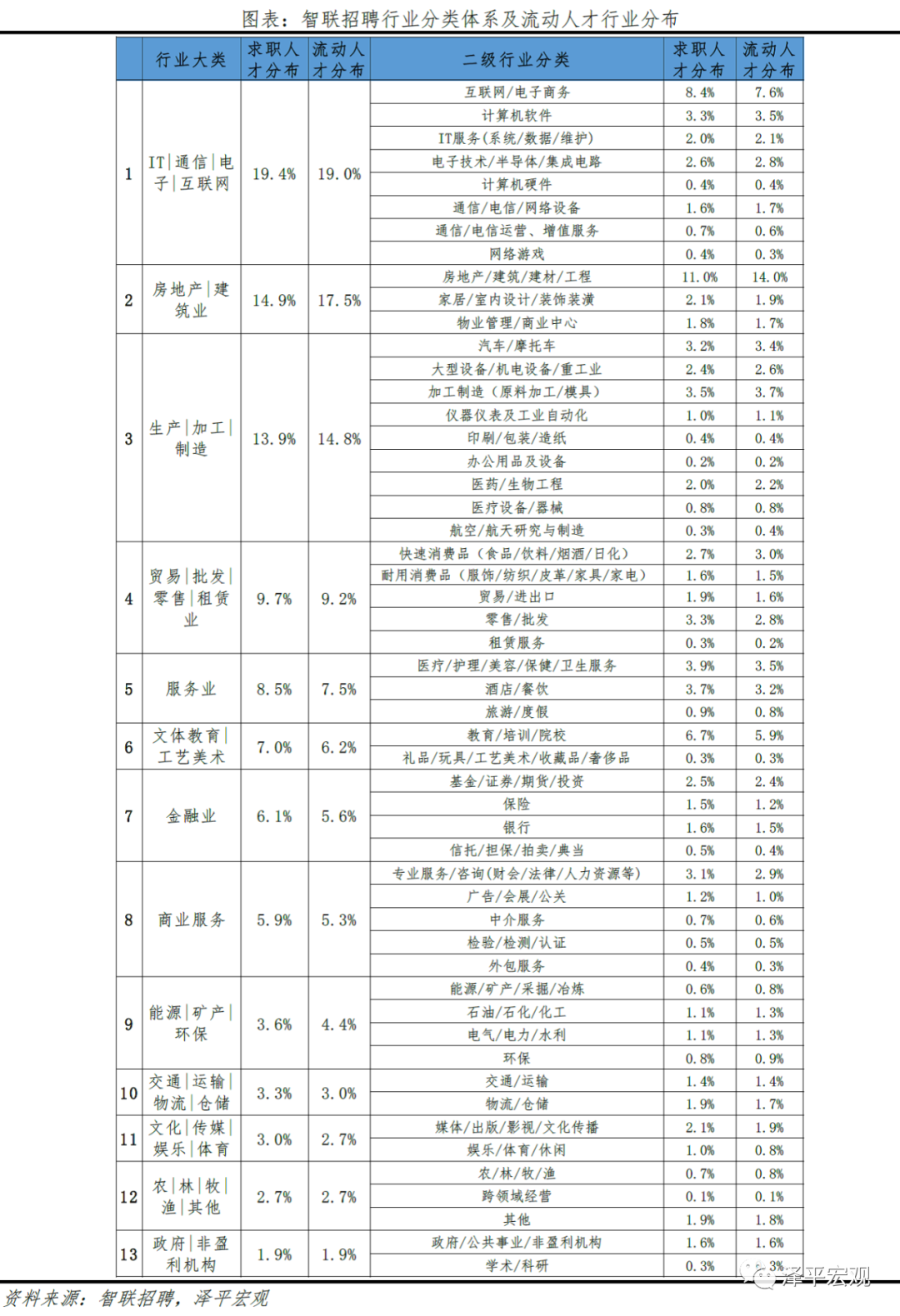 6)从行业看,流动人才中51%分布在IT、房地产、制造业,高于求职人才总体的48%。2019年求职人才最多的前三行业是IT|通信|电子|互联网、房地产|建筑业、生产|加工|制造,分别占比19.4%、14.9%、13.9%,合计占比48.3%;流动人才最多的前三行业也是上述三个行业,分别占比19.0%、17.5%、14.8%,合计占比51.4%,说明流动人才分布更加集中,且流动人才在房地产|建筑业的分布远高于求职人才。从二级行业分布来看,2019年求职人才最多的前五行业分别是房地产/建筑/建材/工程、互联网/电子商务、教育/培训/院校、医疗/护理/美容/保健/卫生服务、酒店/餐饮,合计占比33.7%;流动人才最多的前五行业则略有不同,第四和第五名分别是加工制造(原料加工/模具)、医疗/护理/美容/保健/卫生服务,合计占比34.7%。