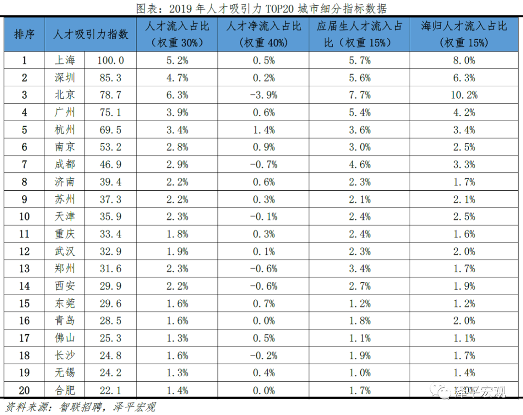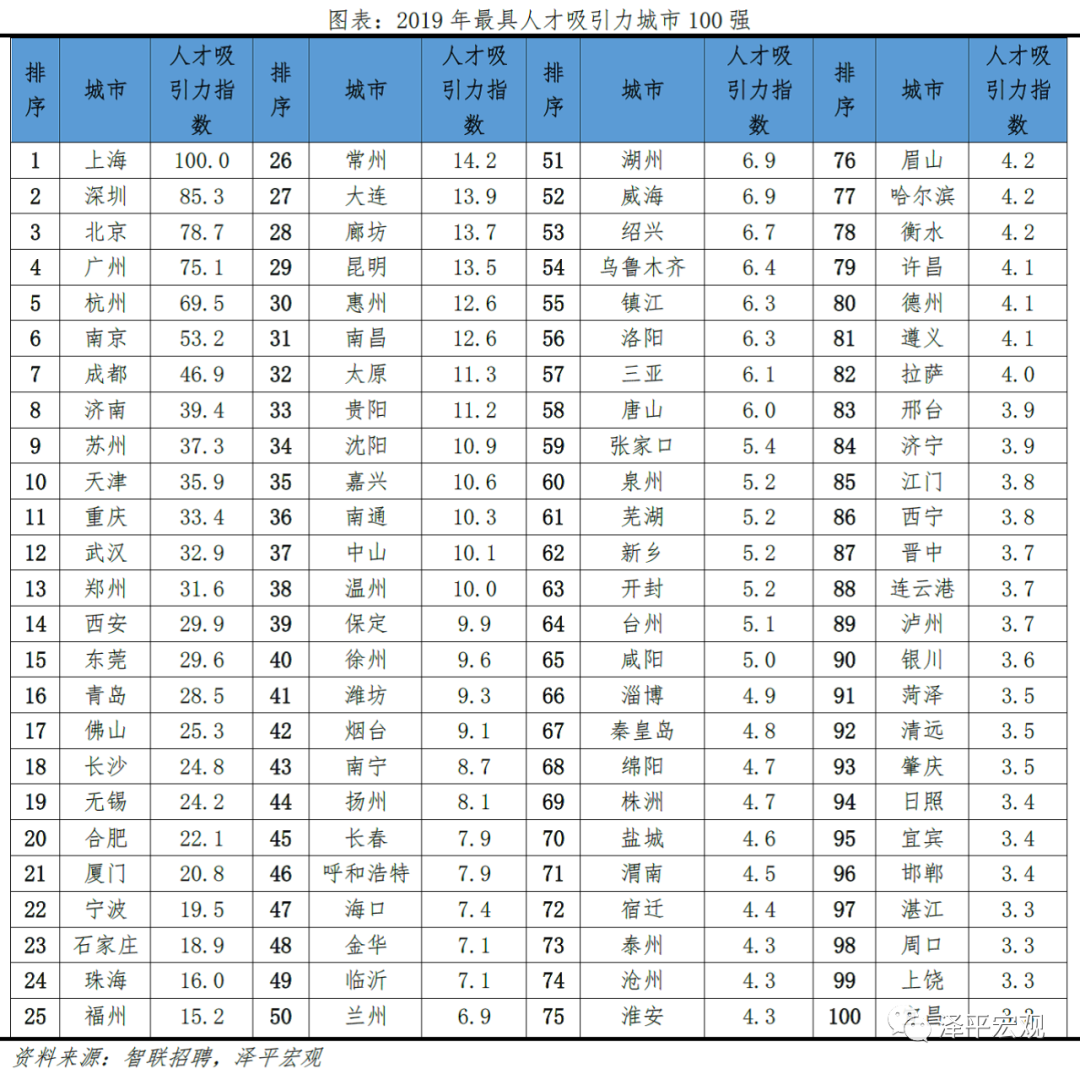 从人才吸引力指数观察,2019年上海、深圳、北京位居前三名,上海连续三年第一,广州、杭州、南京、成都、济南、苏州、天津位居前十。为衡量城市的人才吸引力,定义人才吸引力指数为人才流入占比、人才净流入占比、应届生人才流入占比、海归人才流入占比的加权结果。人才流入占比=流入某城市的人才/全国流动人才总量,人才净流入占比=(流入某城市的人才-流出某城市的人才)/全国流动人才总量,分别反映该城市引得来和留得住的能力。其中,流入某城市的人才指现居住地不在该城市、但简历投向了该城市的人才;流出某城市的人才指现居住地为该城市、但简历投向了其他城市的人才;全国流动人才总量指现居住地和简历投向地不一致的人才。应届生人才流入占比=流入某城市的应届生流动人才/应届生流动人才总量,海归人才流入占比=流入某城市的海归流动人才/海归流动人才总量,分别反映城市对年轻高学历人才和海归高学历人才的吸引力。从结果看,经济体量大且增长稳定的上海市人才吸引力指数2017年由第二名升至第一名,随后三年持续第一;由于深圳经济发展速度较快且人才政策吸引力强,2016-2019年深圳排名第3、3、3、2位;北京因严控人口、疏解产业,排名为第1、2、2、3位,有所下降;广州则始终为第4位;杭州因电商为代表的产业发展迅速,连续四年稳居第5;南京为第6、6、7、6名;成都2019年为第7名且近三年较为稳定;济南2019年为第8名,比2018年的第14名有所上升;苏州为第7、8、9、9,较为稳定;天津为第8、10、12、10名。2019年前50强中,东部、中部、西部、东北地区分别有33、6、8、3个;一二三四线分别有4、32、14、0个,分别占一二三四线城市数量的100%、91%、17%、0%;长三角、珠三角、京津冀、成渝、长江中游城市群分别有12、7、5、2、3个。
