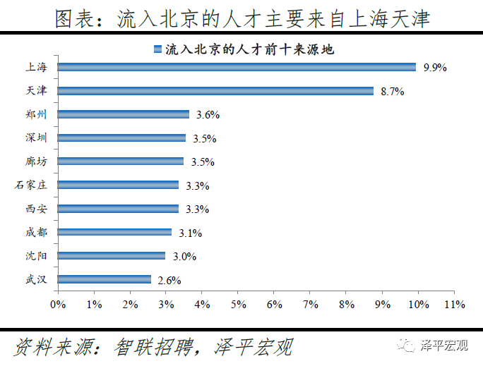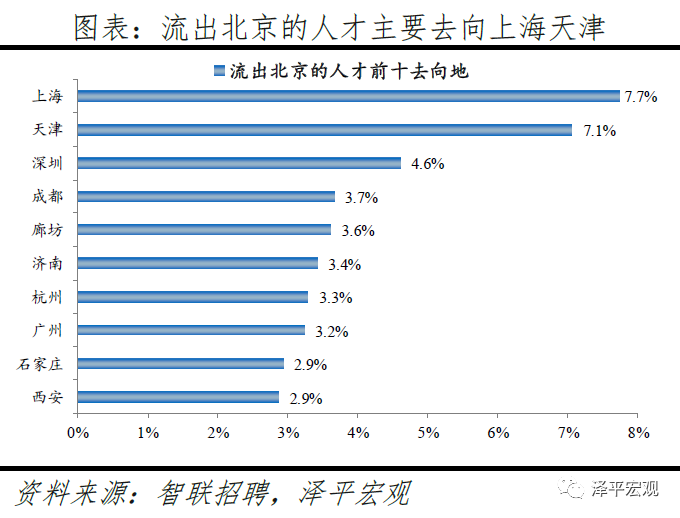 1)北京:2016-2019年人才净流入占比分别为-0.7%、-2.3%、-2.7%、-3.9%,持续为负且降幅扩大,主因北京严控人口、疏解产业;北京和上海互为人才外流第一目标城市,北京流向上海、上海流向北京的人才流出在全国流动人才总量中占比分别为0.8%、0.6%,人才从北京净流向上海。北京常住人口增量逐年下滑,2011-2018年从57万降至-17万,2019年缩窄至-1万,2017-2019年连续3年为负,2016-2019年北京的常住人口增量始终在一线城市中最低。2016-2019年北京人才流入占比分别为7.2%、7.3%、7.1%、6.3%,但人才流出占比持续攀升,分别达7.9%、9.6%、9.9%、10.2%,北京的人才流入和人才流出均居全国城市首位,但流出逐年攀升、流出明显大于流入,使得人才净流入占比分别为-0.7%、-2.3%、-2.7%、-3.9%。从来源看,2019年人才向北京流入的前十大城市分别为上海、天津、郑州、深圳、廊坊、石家庄、西安、成都、沈阳、武汉,合计占比达44.7%。其中,京津冀城市有3个,合计占比达15.6%。人才流入北京主要因为北京经济体量大、薪酬水平高,2019年GDP规模达到3.5万亿,仅次于上海、排名第二,同时13个行业中北京有8个的薪酬位于所有城市之首。从去向看,北京人才外流的前十大城市分别为上海、天津、深圳、成都、廊坊、济南、杭州、广州、石家庄、西安,合计占比达42.5%。其中,流出北京的人才中7.7%流向上海,流出上海的人才中13.1%流向北京,北京和上海互为人才外流目标城市的第1位,北京流向上海和上海流向北京的人才流出在全国流动人才总量中占比分别为0.8%、0.6%,人才从北京净流向上海。流出北京的人才增多主要因为北京控制人口、疏解产业。2013年北京开始严控人口,2015年发布的《京津冀协同发展规划纲要》要求北京外迁非首都核心功能,2020年及之后北京常住人口控制在2300万人以内。根据北京市发改委,截至2019年底,北京市不予办理的工商登记业务累计达2.28万件;2014-2019年北京市退出一般制造业企业2759家,疏解提升市场631个、物流中心122个。根据国家统计局数据,2014-2018年北京规模以上工业企业单位数累计减少489家。2019年北京流出人才的29.7%来源于IT|通信|电子|互联网行业,高于除深圳外的其他8个重点城市,也高于北京流入人才流向该行业的比例23.4%。