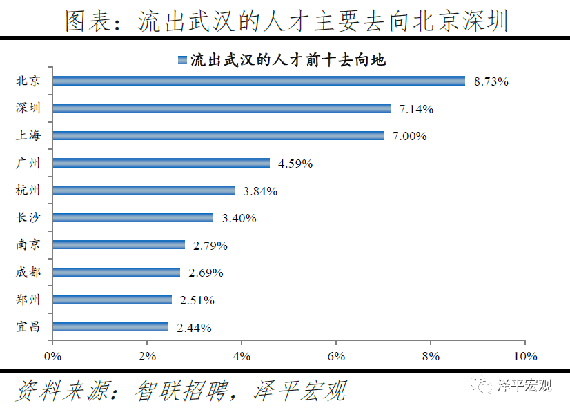 4)武汉:2016-2019年人才净流入占比分别为-0.3%、0.0%、0.8%、0.1%,2017年由负转正,主因“百万大学生留汉”政策实施。2011-2019年武汉常住人口增量平均为16万人,常住人口保持较高增长。2016-2019年武汉人才流入占比分别为2.1%、2.2%、2.7%、1.9%,人才流出占比2.3%、2.1%、1.9%、1.8%,逐年下降,使得人才净流入占比分别为-0.3%、0.0%、0.8%、0.1%。主要因为2017年开始的“百万大学生留汉创业就业工程”,大学生可以低于市场价20%买到安居房或租到租赁房;不满40周岁的留汉大学毕业生可凭毕业证落户,硕士、博士不受年龄限制可直接落户;专科、本科、硕士、博士的指导性最低年薪标准分别为4万元、5万元、6万元、8万元。根据武汉市委组织部,2017-2019年新增留汉大学生共109.5万人,提前两年完成2017年确定的五年达到100万的目标。从来源看,人才向武汉流入的前十大城市分别为北京、深圳、上海、郑州、长沙、成都、广州、西安、杭州、襄阳,合计占比达45.0%。从去向看,武汉人才外流的前十大城市分别为北京、深圳、上海、广州、杭州、长沙、南京、成都、郑州、宜昌,合计占比达45.1%。