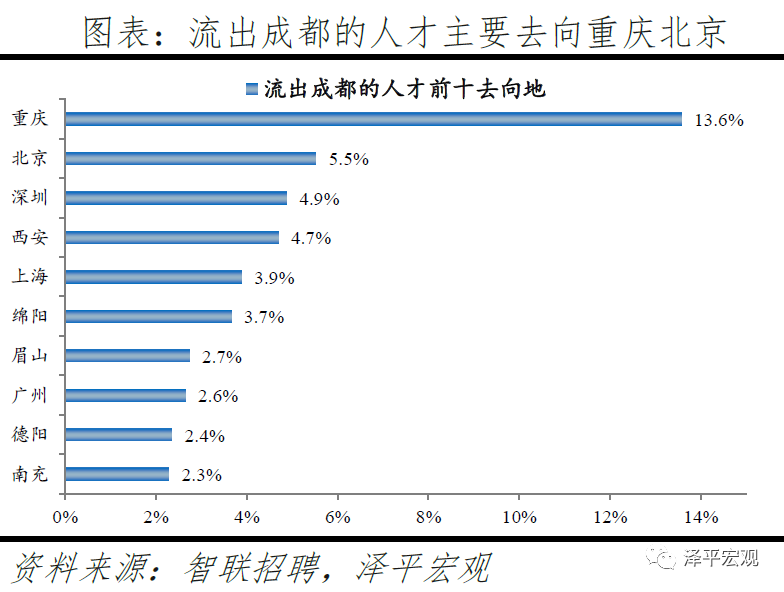 3)重庆:2016-2019年人才净流入占比分别为-0.1%、-0.1%、0.5%、0.3%,2018年由负转正主因对信息技术产业具有较强的人才吸引力。重庆常住人口增量维持在高位,2011-2019年增量平均为27万。2016-2019年重庆人才流入占比总体呈上升趋势,分别为1.3%、1.3%、2.0%、1.8%,人才流出占比在2016-2018年均为1.4%、2019年上升至1.6%,导致人才净流入占比分别为-0.1%、-0.1%、0.5%、0.3%,逐年上升且2018年由负转正。从来源看,人才向重庆流入的前十大城市分别为成都、北京、西安、长沙、上海、深圳、天津、贵阳、广州、武汉,合计占比达62.8%。其中,成都流入重庆占比达26.4%,高于大部分城市第一来源地占比,主要因为地理位置近且电子产业等具有较强吸引力。2019年重庆流入人才中25.7%流向IT|通信|电子|互联网行业,高于除杭州外的其余8个重点城市,也明显高于流出人才从事该行业的比例13.1%,其中2019年重庆流入人才中14.4%流向互联网/电子商务的二级行业中,显著高于其余9个重点城市。根据国家统计局和中国电子信息产业统计年鉴数据,重庆电子商务企业个数2013-2018年从640个增加到2545个;重庆规模以上电子信息企业个数2008-2017年从68个增加到540个。重庆市统计局数据显示,2019年1-11月重庆规上软件和信息技术服务业营收同比增长45.2%,高于全国2019年信息技术服务业营收增速的20.8%。从去向看,重庆人才外流的前十大城市分别为成都、北京、上海、深圳、广州、西安、杭州、贵阳、武汉、昆明,合计占比达51.0%。