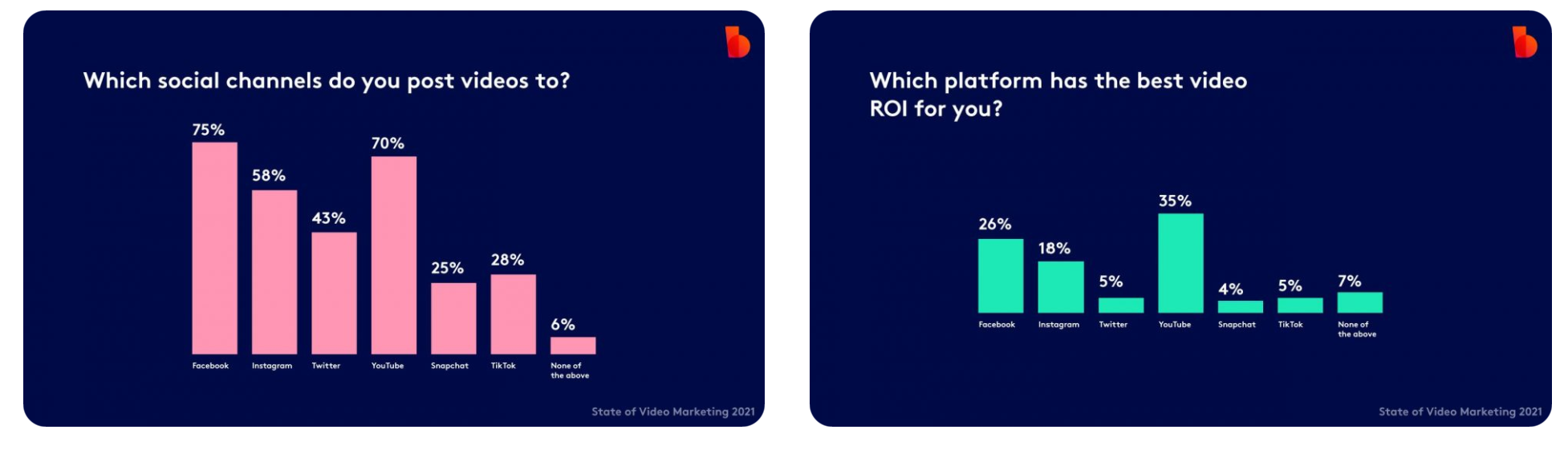 Facebook是营销人员发布视频最受欢迎的(75%)社交频道,其次是YouTube(70%),Instagram(58%)。