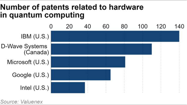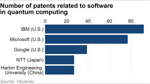 美国在量子技术上领先的主要是量子计算硬件及软件,其中IBM是这两个领域的第一,分别拥有140、80多项专利。