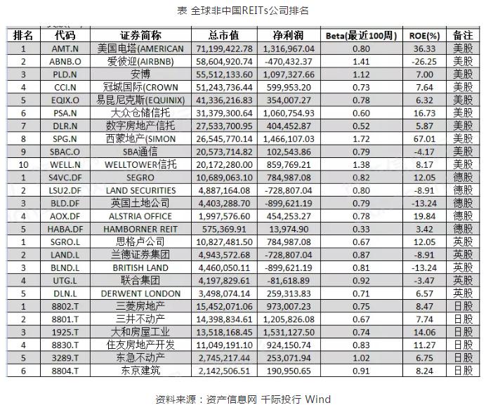 全球非中国主要企业有美国电塔(AMERICAN TOWER)[AMT.N]、爱彼迎(AIRBNB)[ABNB.O]、安博[PLD.N]、易昆尼克斯(EQUINIX)[EQIX.O]、大众仓储信托[PSA.N]、数字房地产信托[DLR.N]、西蒙地产(SIMON PROPERTY)[SPG.N]、SEGRO[S4VC.DF]、LAND SECURITIES GROUP[LSU2.DF]、英国土地公司[BLD.DF]、ALSTRIA OFFICE[AOX.DF]、HAMBORNER REIT[HABA.DF]、思格卢公司[SGRO.L]、兰德证券集团[LAND.L]、BRITISH LAND[BLND.L]、联合集团[UTG.L]、DERWENT LONDON[DLN.L]、三菱房地产[8802.T]、三井不动产[8801.T]、大和房屋工业[1925.T]、住友房地产开发[8830.T]、东急不动产[3289.T]、东京建筑[8804.T]等。
