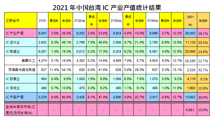 根据最新预测,2021年中国台湾IC产业产值达1285亿美元,较2020年成长18.1%。