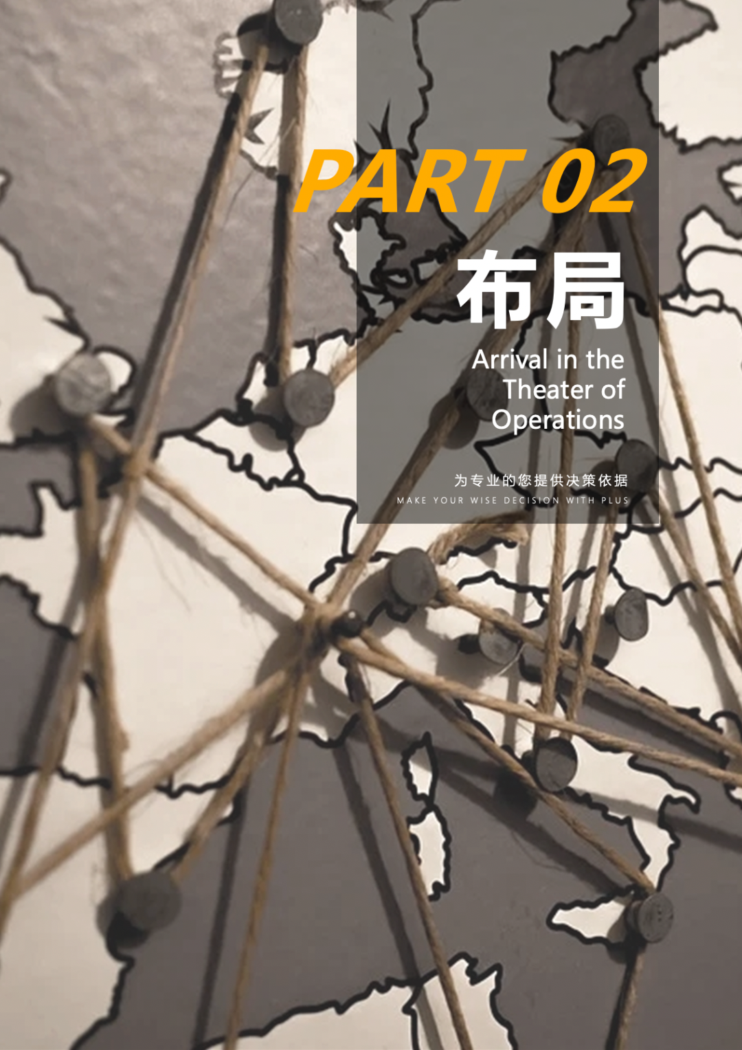 2.第二部分为布局,为在华中端及以上档次品牌在五个维度上的布局现状与趋势,同样有大量的数据展示,包括地理维度、时间线维度、以及品牌价值主张中的人、情、景三个维度。
