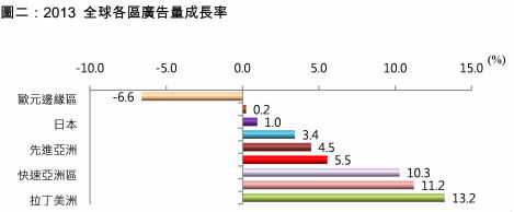 北欧/中欧地区及日本属于低成长区,前者与西欧国家间的贸易往来密切,因此广告预算也遭到冻结,预估2013年的广告量仅微幅成长0.2%。日本虽然快速的从311地震中恢复,但经济成长率表现仍有待观察,加上有通货紧缩的趋势,预估2013年的广告量成长率预估为1%。